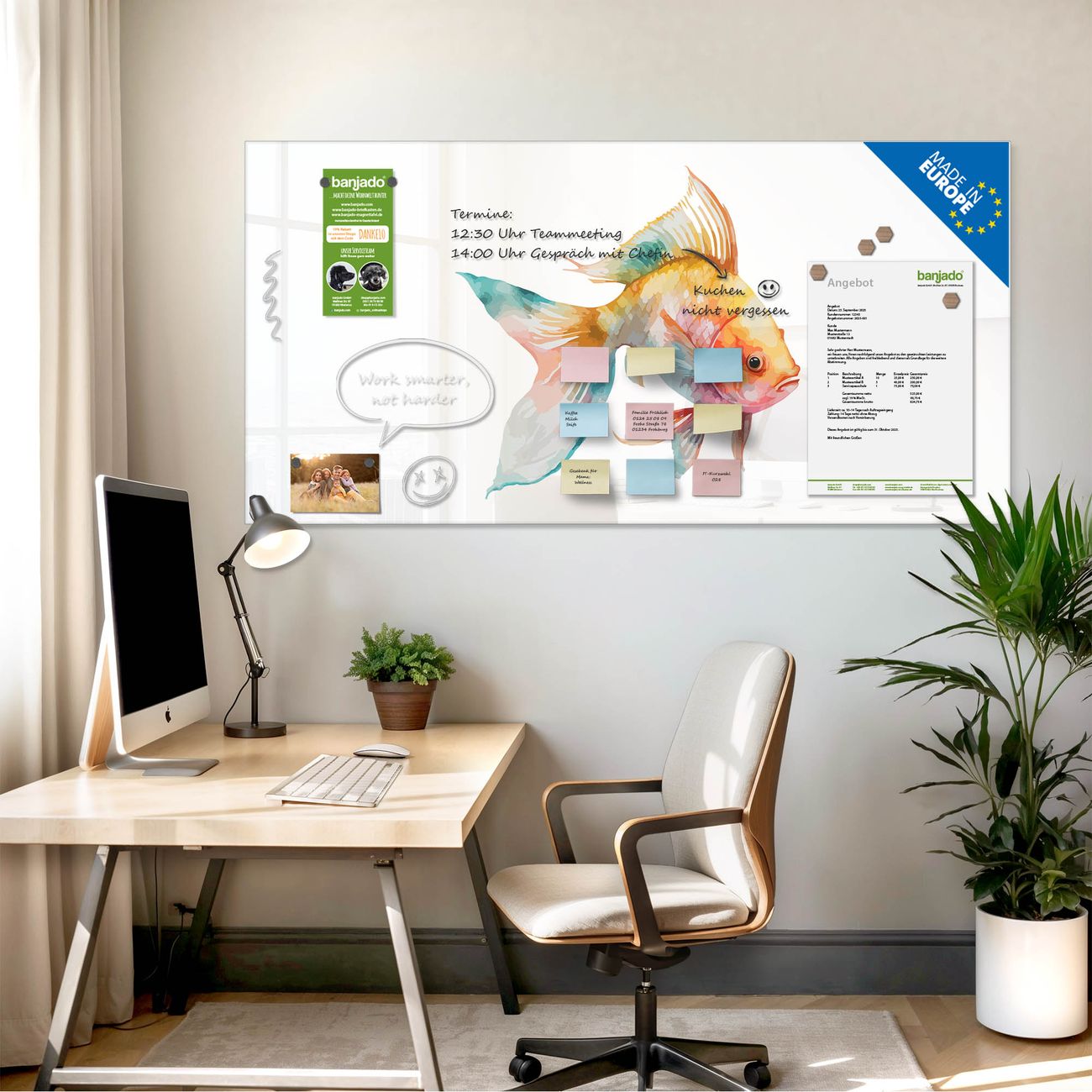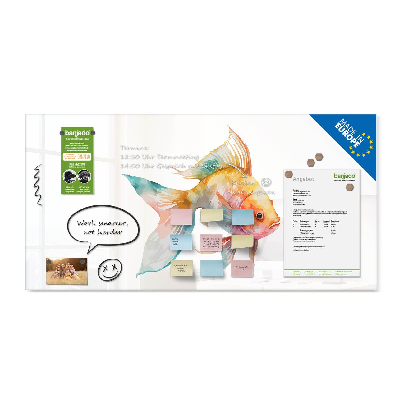 Ein Stück Design, das Ihren Alltag organisiert. Schreiben, heften, inspirieren - alles an einem Ort. Qualität, die man spürt. Montage leicht gemacht. Handwerk mit Herz - veredelt in Sachsen. Einzigartiges Design mit Motiv Motiv Farbenfroher Goldfisch Beschreibbare Glasoberfläche, leicht zu reinigen Starke Magnetkraft durch Stahlrückwand Inklusive 4 Neodym-Magneten Flexible Montageoptionen Handveredelt in Sachsen - Qualität, die bleibt