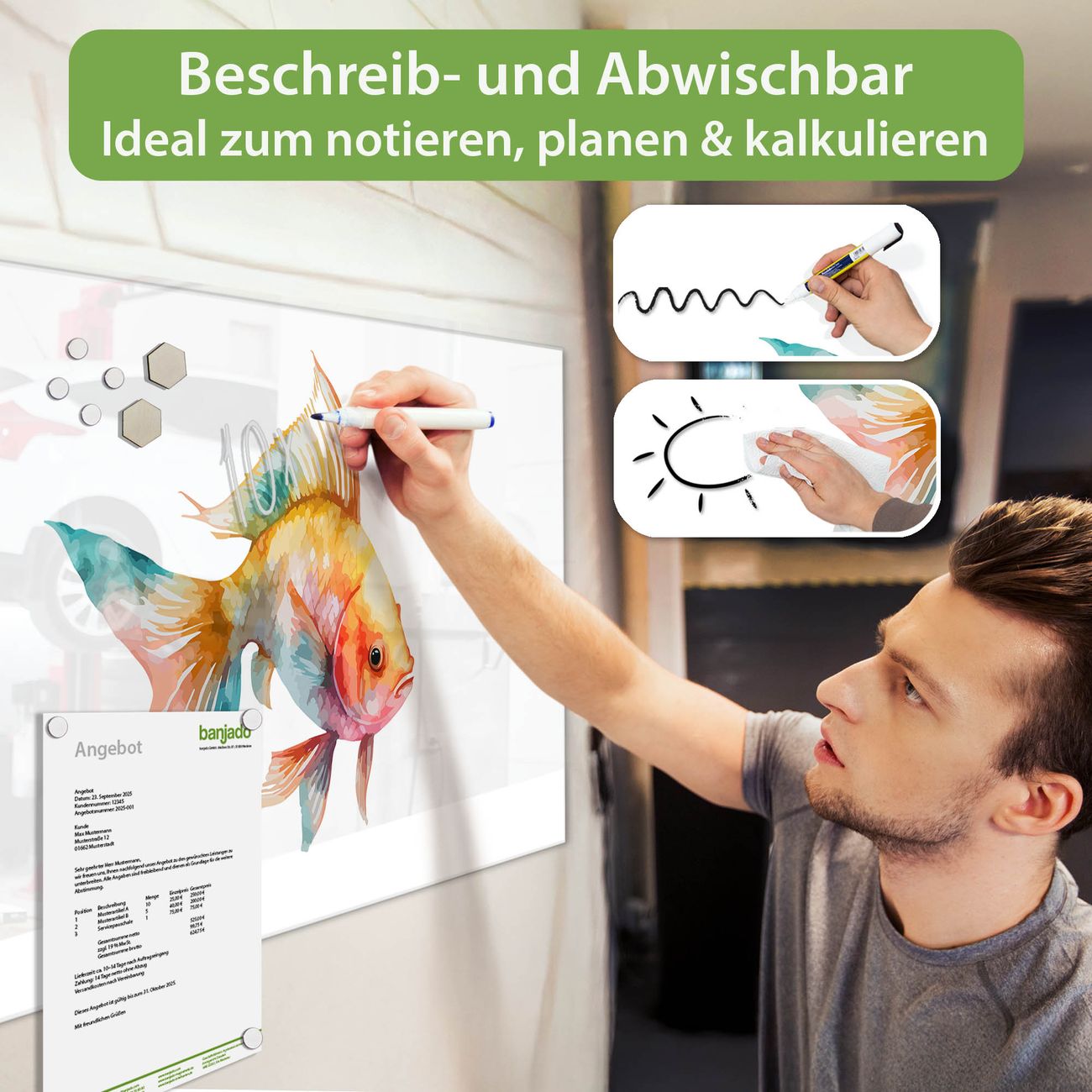Die banjado Glas Magnettafel mit dem Motiv Motiv Farbenfroher Goldfisch verbindet Funktionalität mit Stil. Sie ersetzt das Zettelchaos durch klare Strukturen und bringt dabei eine warme, natürliche Atmosphäre in Ihr Zuhause. Ob im Büro, in der Küche oder im Eingangsbereich - dieses Design-Board zieht Blicke an und sorgt für Ordnung mit Charakter.