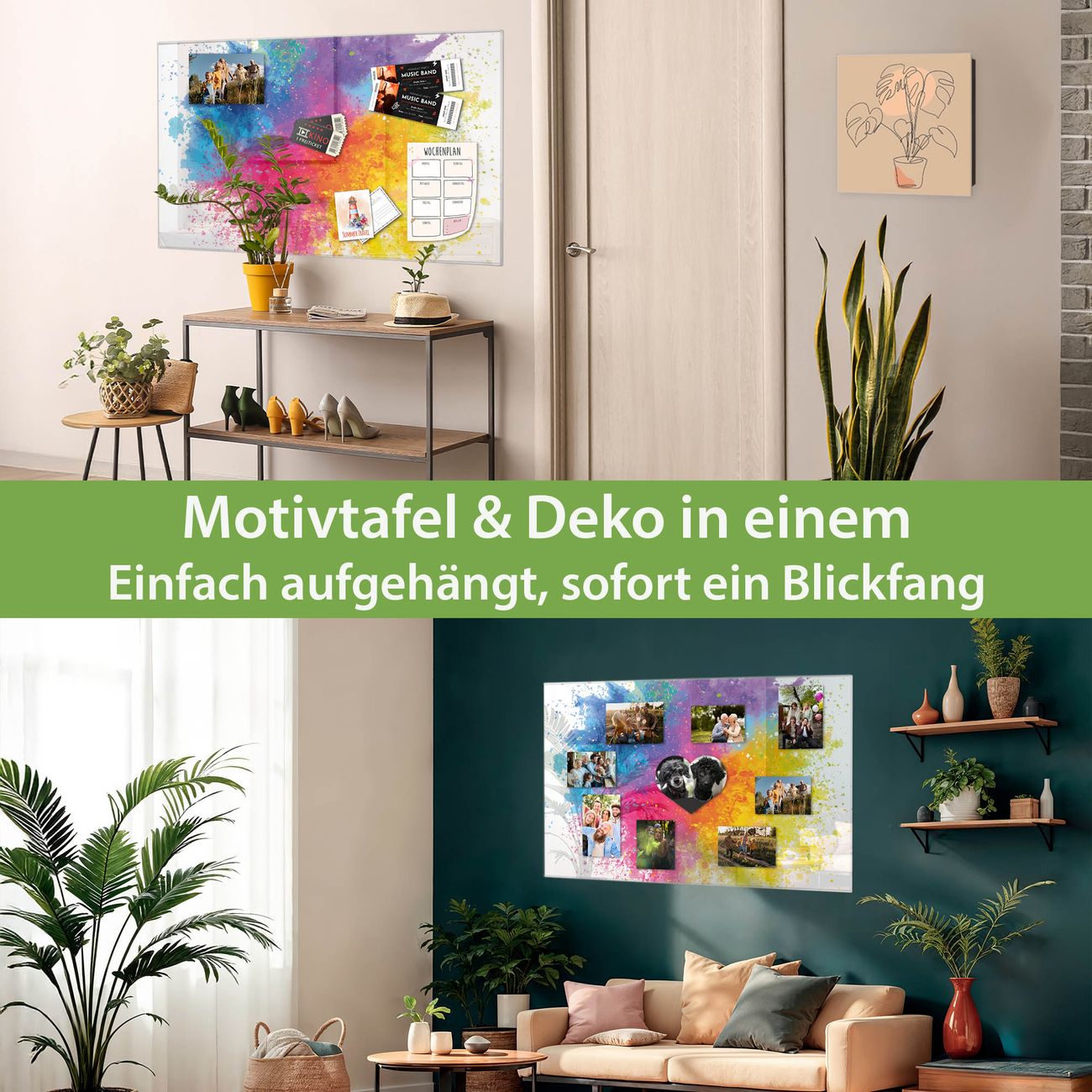 Ein Stück Design, das Ihren Alltag organisiert. Schreiben, heften, inspirieren - alles an einem Ort. Qualität, die man spürt. Montage leicht gemacht. Handwerk mit Herz - veredelt in Sachsen. Einzigartiges Design mit Motiv Motiv Farbexplosion 2 Beschreibbare Glasoberfläche, leicht zu reinigen Starke Magnetkraft durch Stahlrückwand Inklusive 4 Neodym-Magneten Flexible Montageoptionen Handveredelt in Sachsen - Qualität, die bleibt