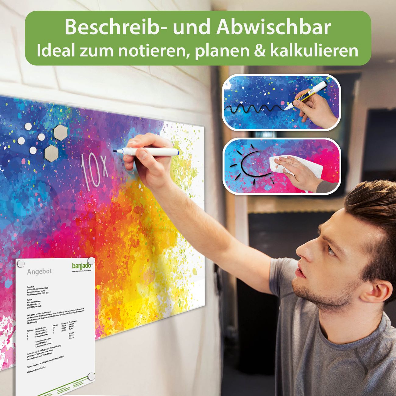 Die banjado Glas Magnettafel mit dem Motiv Motiv Farbexplosion 2 verbindet Funktionalität mit Stil. Sie ersetzt das Zettelchaos durch klare Strukturen und bringt dabei eine warme, natürliche Atmosphäre in Ihr Zuhause. Ob im Büro, in der Küche oder im Eingangsbereich - dieses Design-Board zieht Blicke an und sorgt für Ordnung mit Charakter.