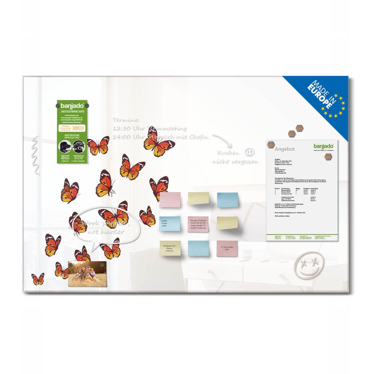 Ein Stück Design, das Ihren Alltag organisiert. Schreiben, heften, inspirieren - alles an einem Ort. Qualität, die man spürt. Montage leicht gemacht. Handwerk mit Herz - veredelt in Sachsen. Einzigartiges Design mit Motiv Motiv Farbige Schmetterlinge Beschreibbare Glasoberfläche, leicht zu reinigen Starke Magnetkraft durch Stahlrückwand Inklusive 4 Neodym-Magneten Flexible Montageoptionen Handveredelt in Sachsen - Qualität, die bleibt