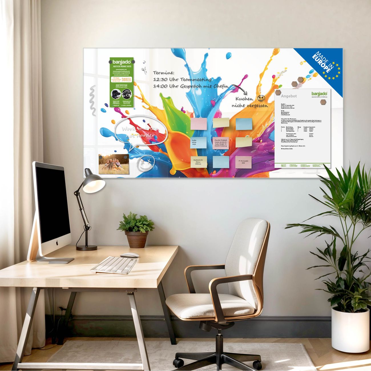 Ein Stück Design, das Ihren Alltag organisiert. Schreiben, heften, inspirieren - alles an einem Ort. Qualität, die man spürt. Montage leicht gemacht. Handwerk mit Herz - veredelt in Sachsen. Einzigartiges Design mit Motiv Motiv Farbspritzer-Explosion Beschreibbare Glasoberfläche, leicht zu reinigen Starke Magnetkraft durch Stahlrückwand Inklusive 4 Neodym-Magneten Flexible Montageoptionen Handveredelt in Sachsen - Qualität, die bleibt