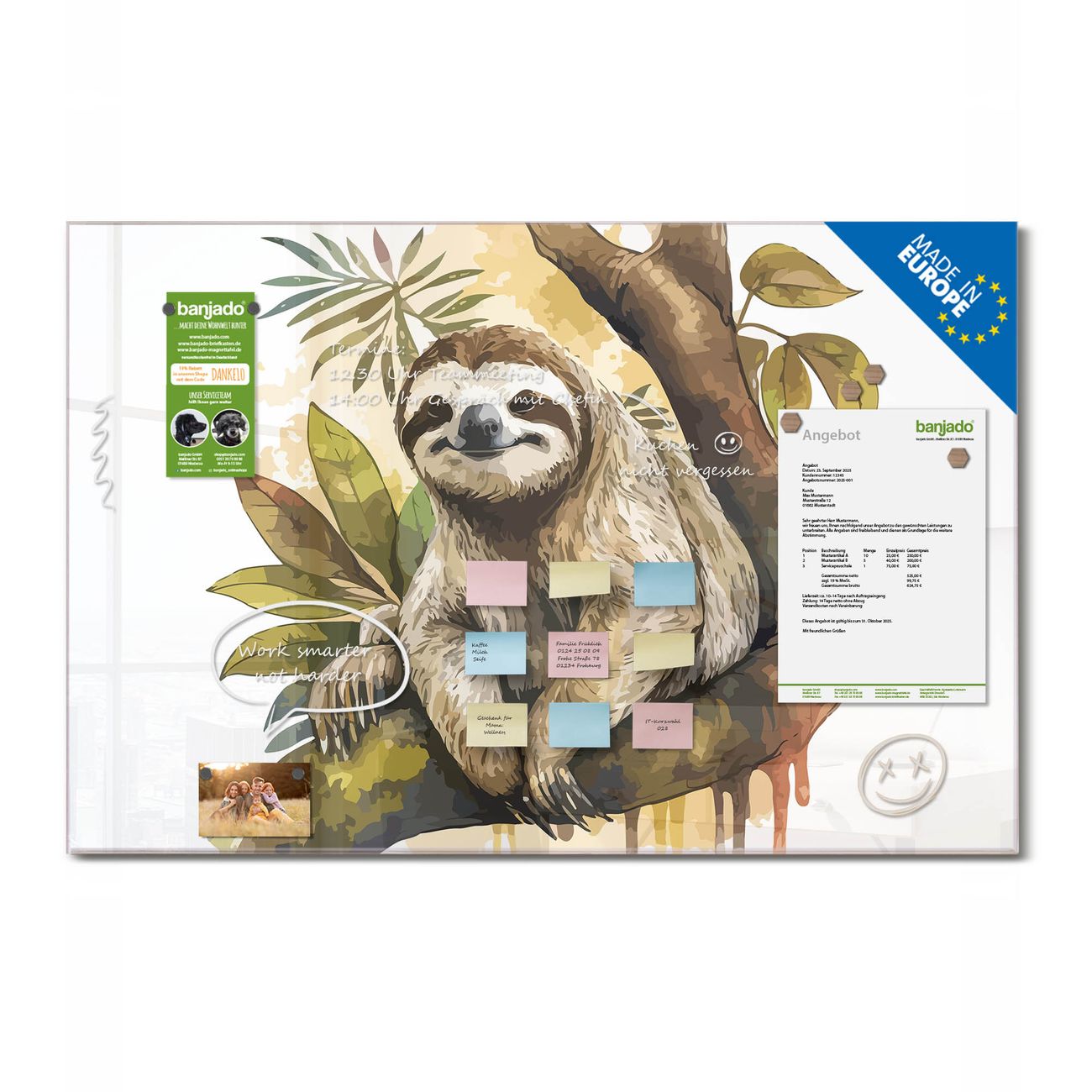 Ein Stück Design, das Ihren Alltag organisiert. Schreiben, heften, inspirieren - alles an einem Ort. Qualität, die man spürt. Montage leicht gemacht. Handwerk mit Herz - veredelt in Sachsen. Einzigartiges Design mit Motiv Motiv Faultier im Baum Beschreibbare Glasoberfläche, leicht zu reinigen Starke Magnetkraft durch Stahlrückwand Inklusive 4 Neodym-Magneten Flexible Montageoptionen Handveredelt in Sachsen - Qualität, die bleibt