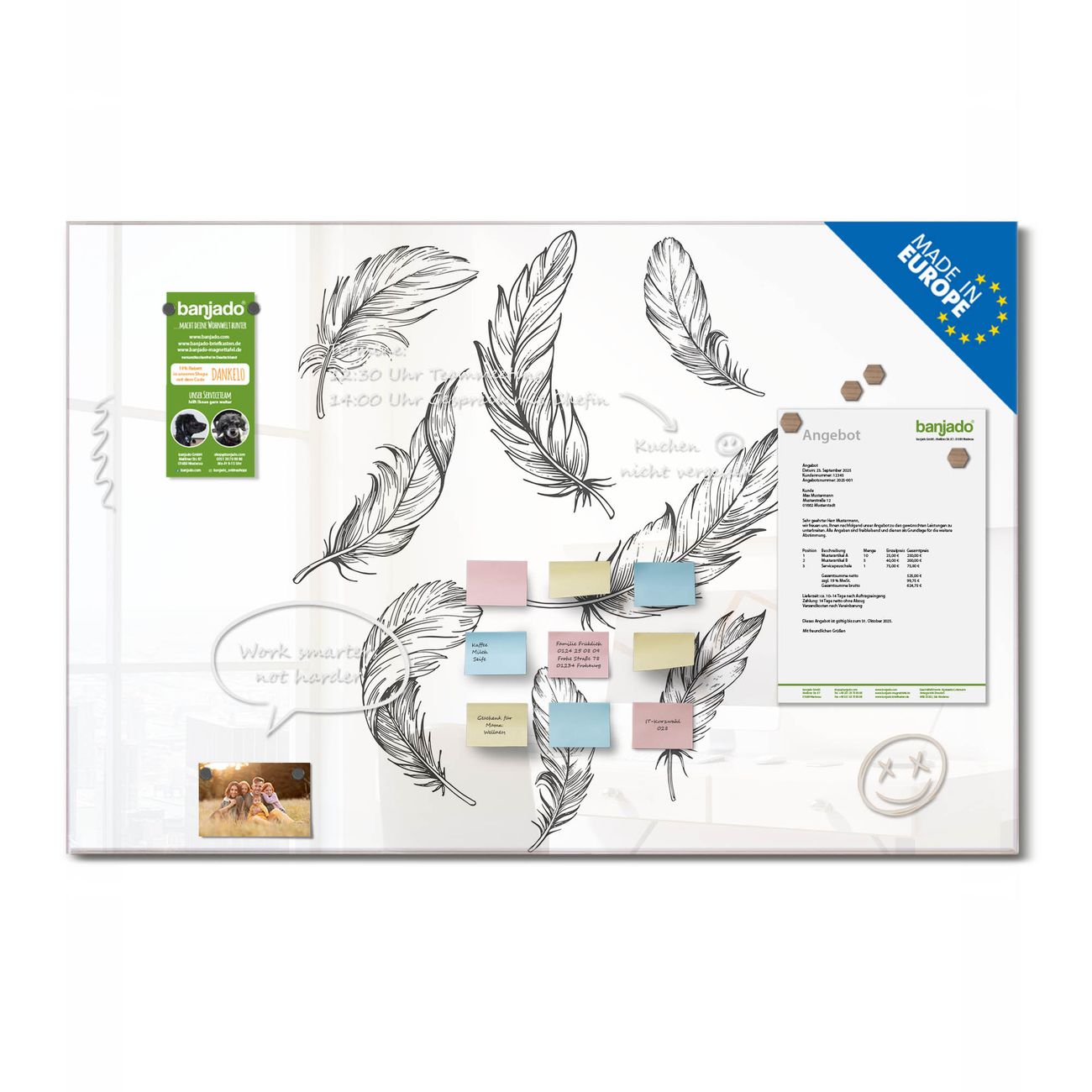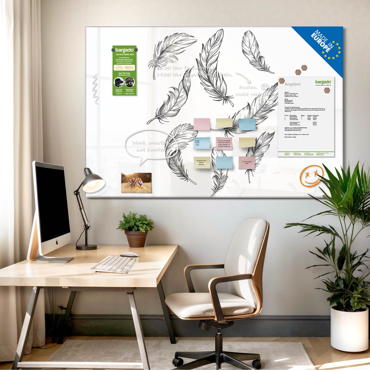 Die banjado Glas Magnettafel mit dem Motiv Motiv Federn 2 verbindet Funktionalität mit Stil. Sie ersetzt das Zettelchaos durch klare Strukturen und bringt dabei eine warme, natürliche Atmosphäre in Ihr Zuhause. Ob im Büro, in der Küche oder im Eingangsbereich - dieses Design-Board zieht Blicke an und sorgt für Ordnung mit Charakter.