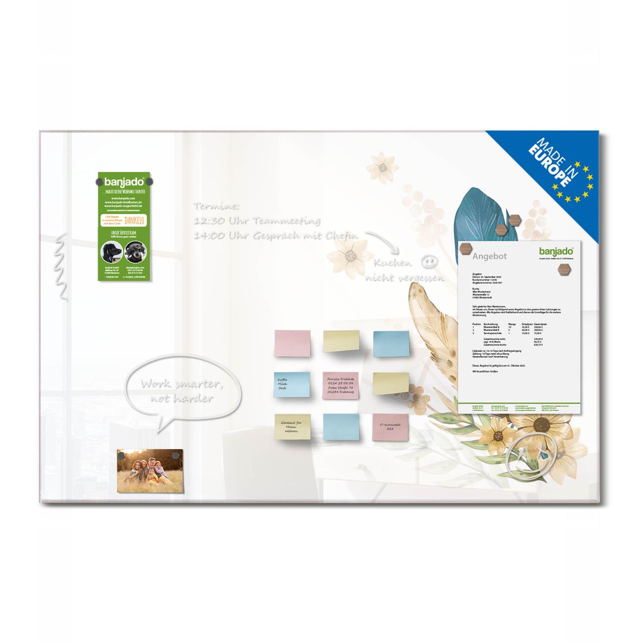 Glas Magnettafel im Querformat Motiv Federn und Blüten Boho