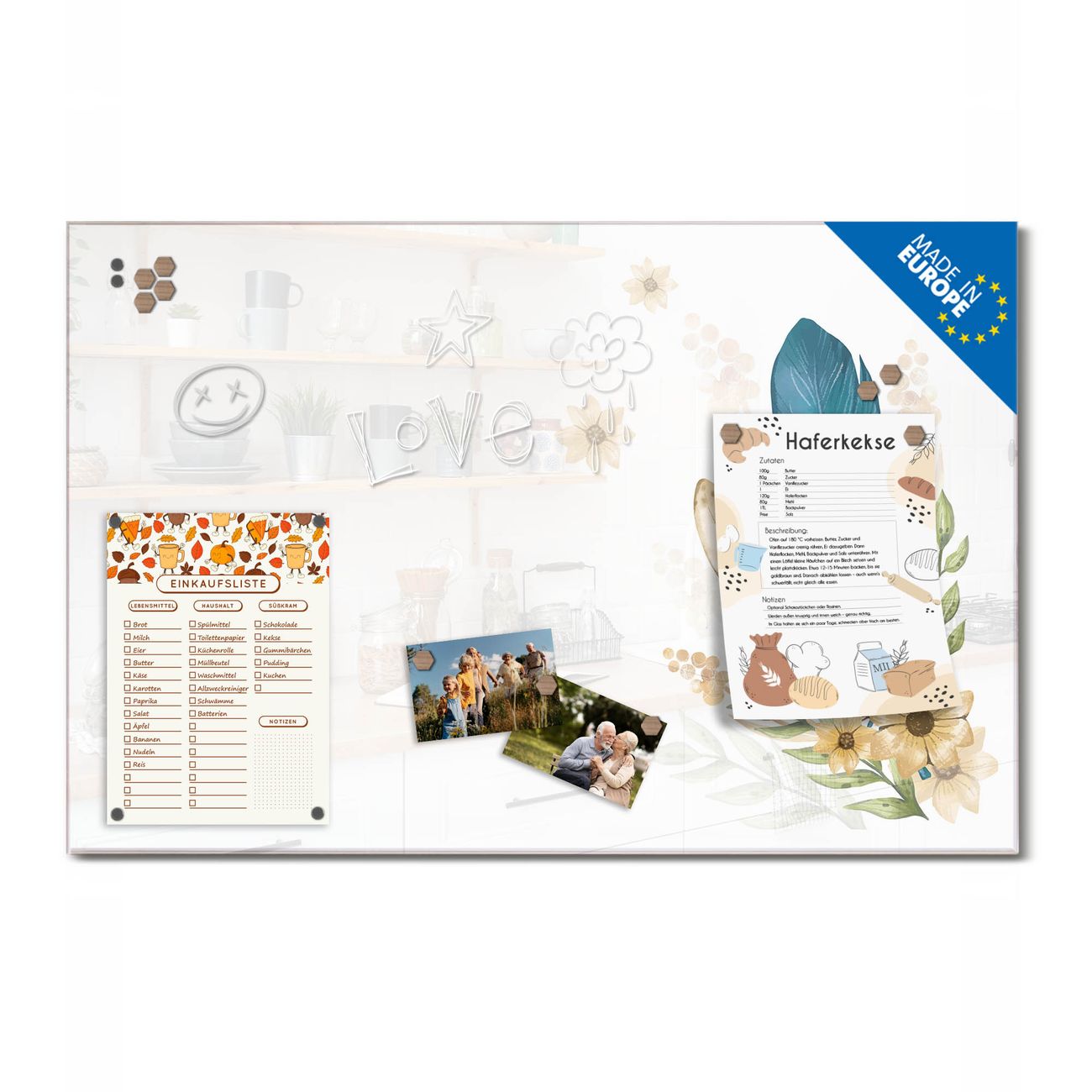 Auf der glatten Glasoberfläche lassen sich Termine, Rezepte oder Notizen ganz einfach mit Kreidestiften festhalten und rückstandslos entfernen. Starke Neodym-Magnete halten Ihre wichtigsten Erinnerungen sicher an Ort und Stelle. So entsteht Ihre ganz persönliche Ideenwand - jeden Tag neu.