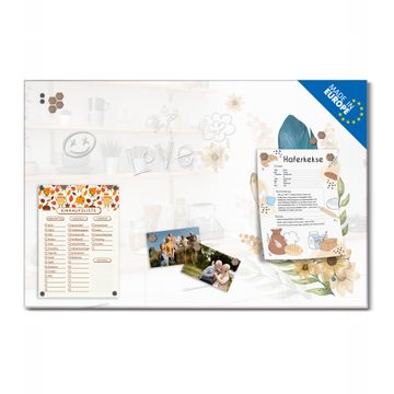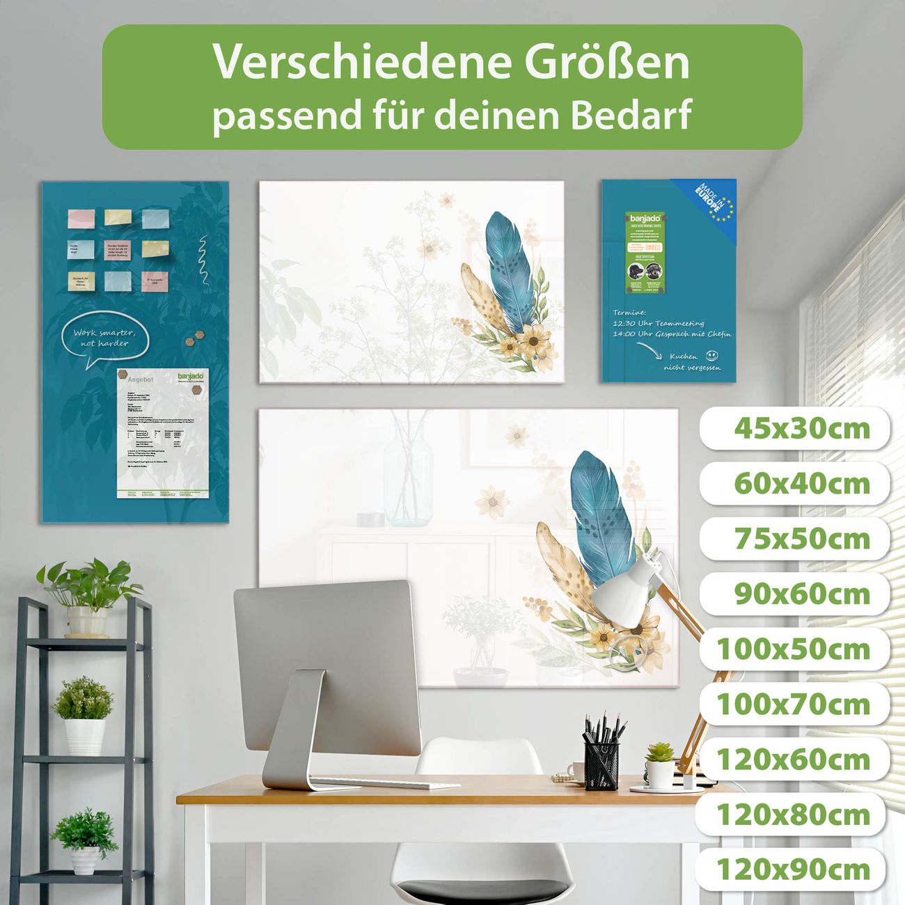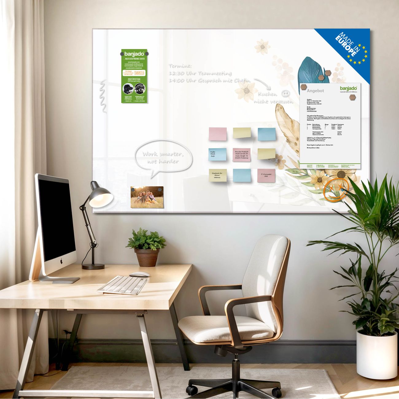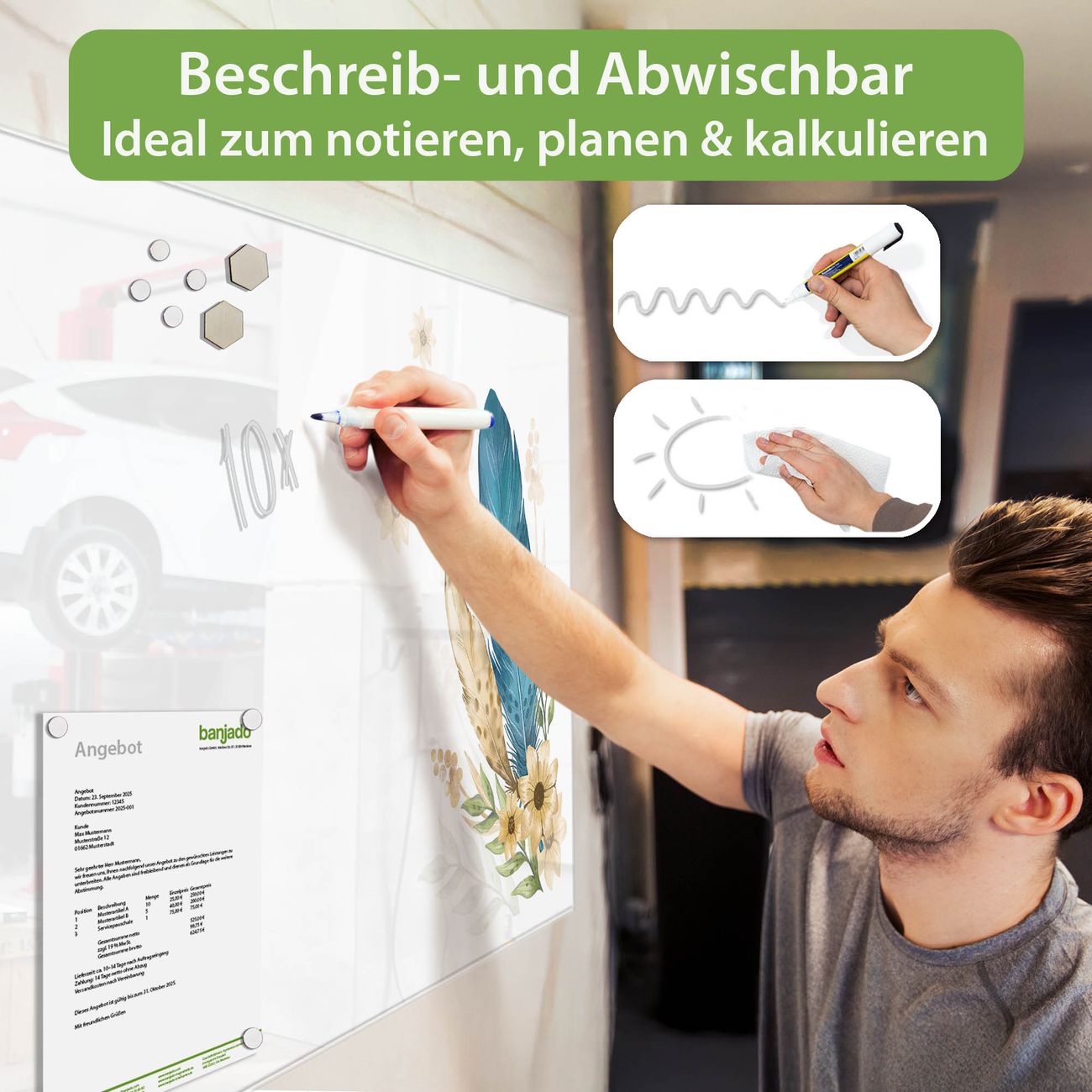 Die banjado Glas Magnettafel mit dem Motiv Motiv Federn und Blüten verbindet Funktionalität mit Stil. Sie ersetzt das Zettelchaos durch klare Strukturen und bringt dabei eine warme, natürliche Atmosphäre in Ihr Zuhause. Ob im Büro, in der Küche oder im Eingangsbereich - dieses Design-Board zieht Blicke an und sorgt für Ordnung mit Charakter.