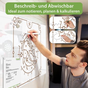 Auf der glatten Glasoberfläche lassen sich Termine, Rezepte oder Notizen ganz einfach mit Kreidestiften festhalten und rückstandslos entfernen. Starke Neodym-Magnete halten Ihre wichtigsten Erinnerungen sicher an Ort und Stelle. So entsteht Ihre ganz persönliche Ideenwand - jeden Tag neu.