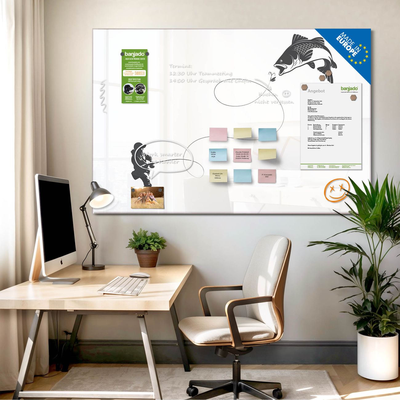 Jede Glas Magnettafel wird in unserer Werkstatt von Hand gefertigt und sorgfältig geprüft. So erhalten Sie ein echtes Qualitätsprodukt, das Funktion und Ästhetik perfekt vereint.?? Warum banjado?