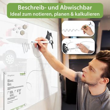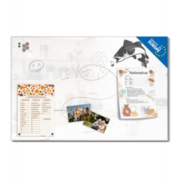 Auf der glatten Glasoberfläche lassen sich Termine, Rezepte oder Notizen ganz einfach mit Kreidestiften festhalten und rückstandslos entfernen. Starke Neodym-Magnete halten Ihre wichtigsten Erinnerungen sicher an Ort und Stelle. So entsteht Ihre ganz persönliche Ideenwand - jeden Tag neu.