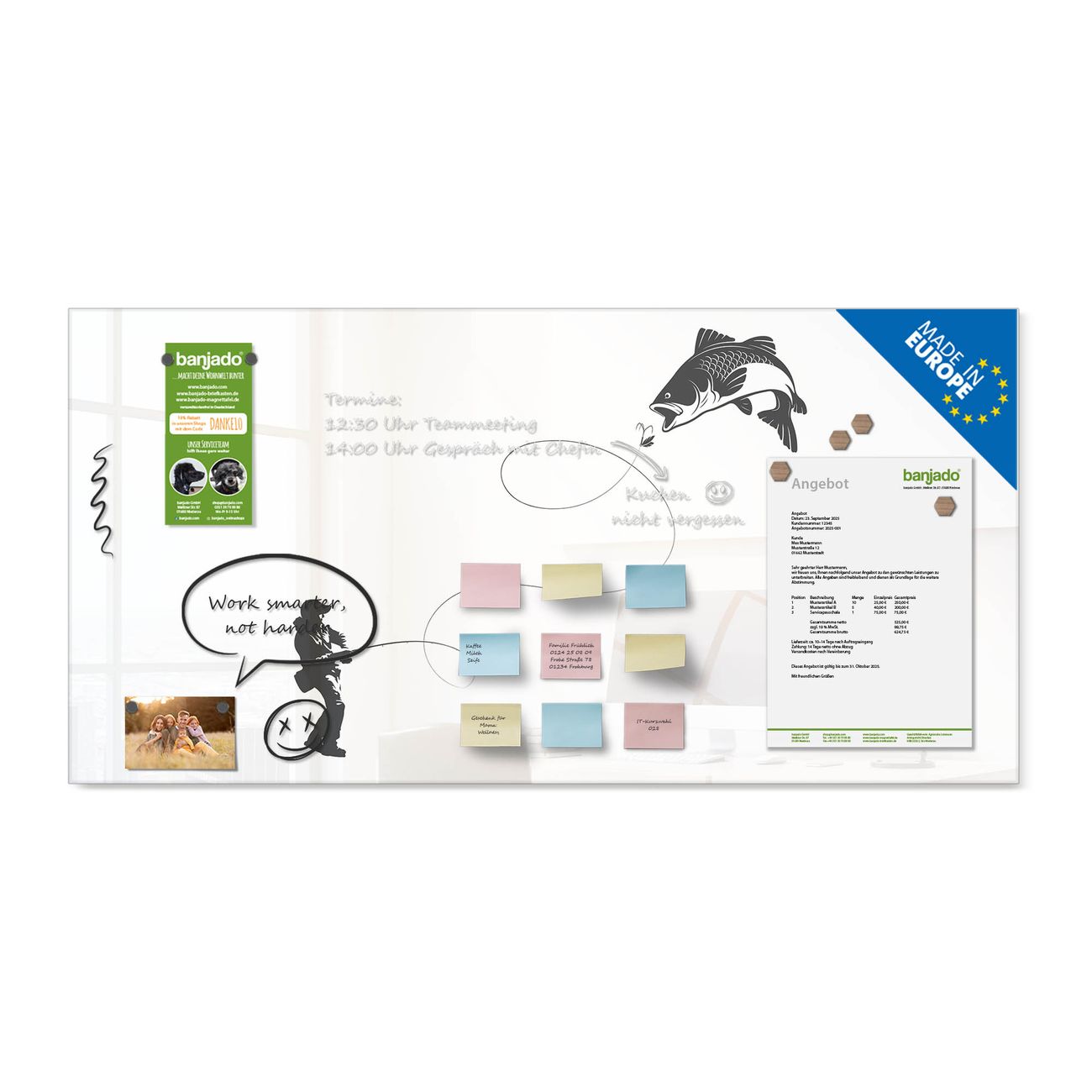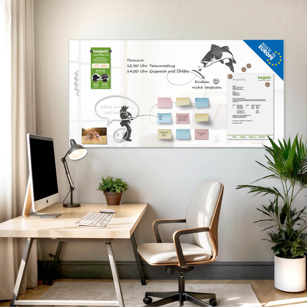 Jede Glas Magnettafel wird in unserer Werkstatt von Hand gefertigt und sorgfältig geprüft. So erhalten Sie ein echtes Qualitätsprodukt, das Funktion und Ästhetik perfekt vereint.?? Warum banjado?