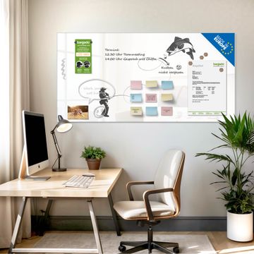 Auf der glatten Glasoberfläche lassen sich Termine, Rezepte oder Notizen ganz einfach mit Kreidestiften festhalten und rückstandslos entfernen. Starke Neodym-Magnete halten Ihre wichtigsten Erinnerungen sicher an Ort und Stelle. So entsteht Ihre ganz persönliche Ideenwand - jeden Tag neu.