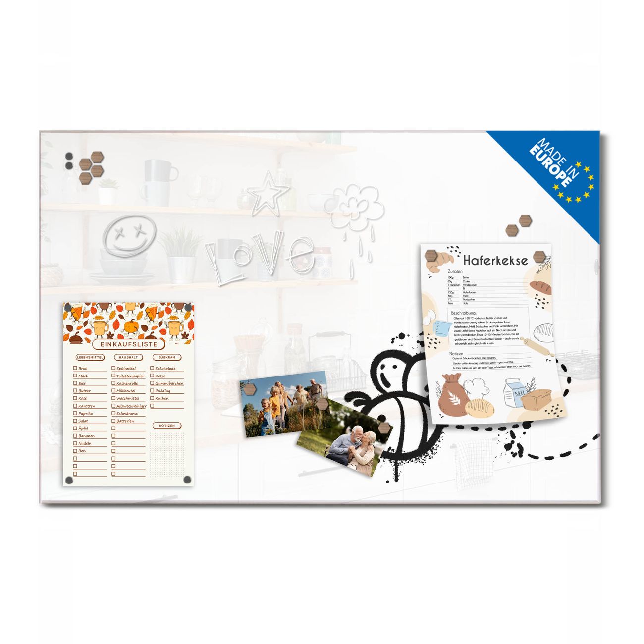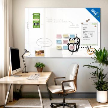 Auf der glatten Glasoberfläche lassen sich Termine, Rezepte oder Notizen ganz einfach mit Kreidestiften festhalten und rückstandslos entfernen. Starke Neodym-Magnete halten Ihre wichtigsten Erinnerungen sicher an Ort und Stelle. So entsteht Ihre ganz persönliche Ideenwand - jeden Tag neu.