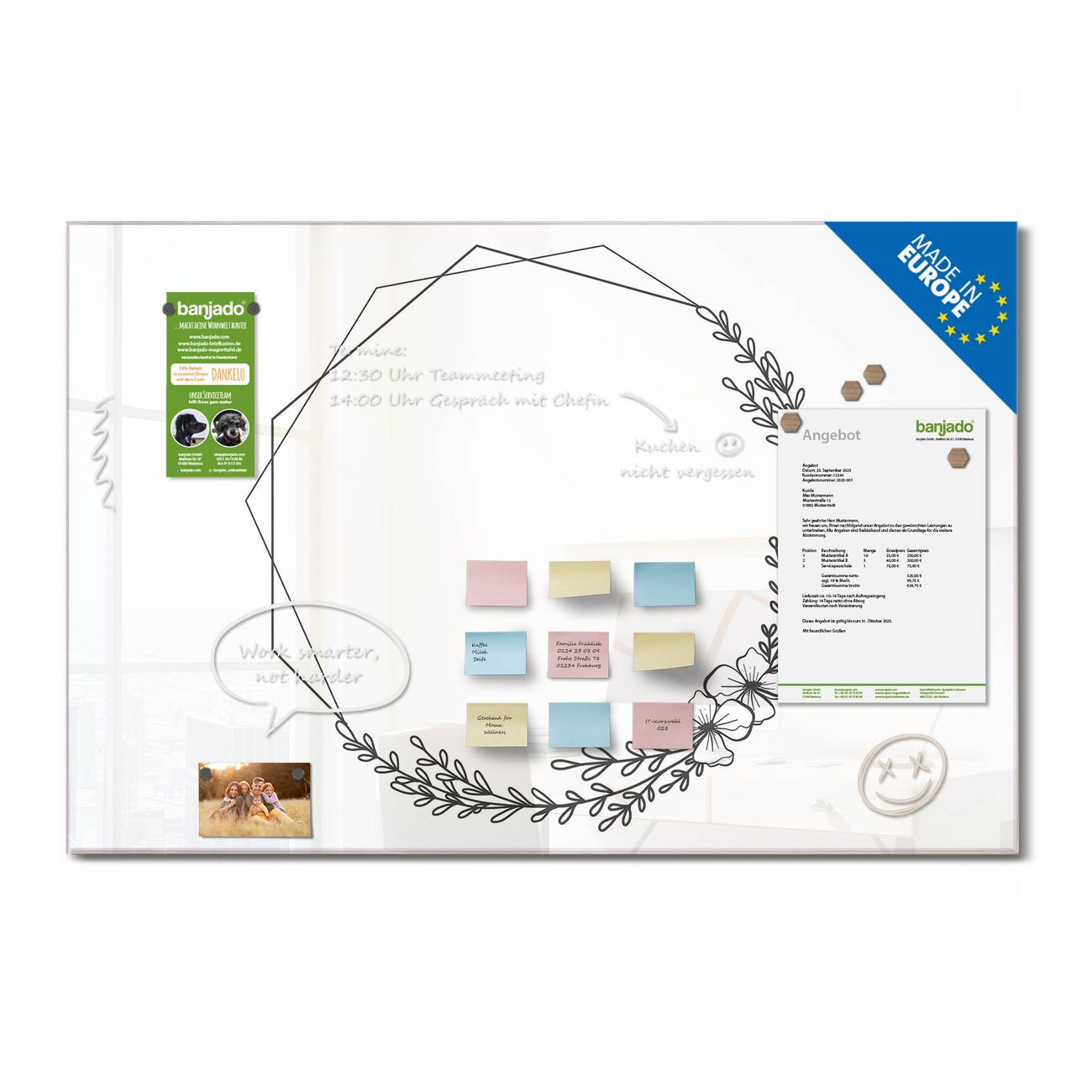 Jede Glas Magnettafel wird in unserer Werkstatt von Hand gefertigt und sorgfältig geprüft. So erhalten Sie ein echtes Qualitätsprodukt, das Funktion und Ästhetik perfekt vereint.?? Warum banjado?
