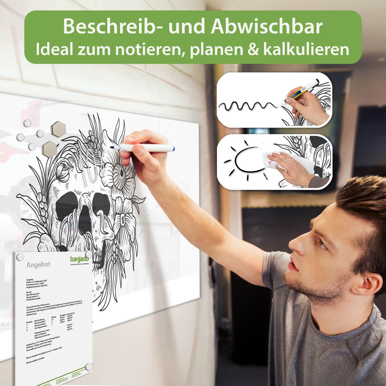 Auf der glatten Glasoberfläche lassen sich Termine, Rezepte oder Notizen ganz einfach mit Kreidestiften festhalten und rückstandslos entfernen. Starke Neodym-Magnete halten Ihre wichtigsten Erinnerungen sicher an Ort und Stelle. So entsteht Ihre ganz persönliche Ideenwand - jeden Tag neu.