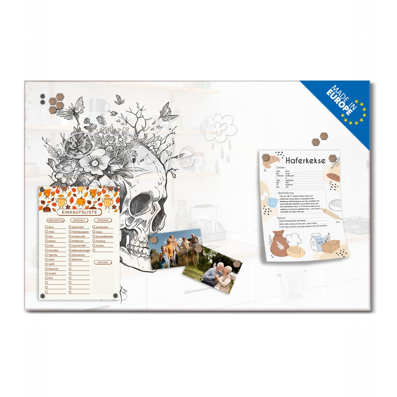 Ein Stück Design, das Ihren Alltag organisiert. Schreiben, heften, inspirieren - alles an einem Ort. Qualität, die man spürt. Montage leicht gemacht. Handwerk mit Herz - veredelt in Sachsen. Einzigartiges Design mit Motiv Motiv Floral Skull Beschreibbare Glasoberfläche, leicht zu reinigen Starke Magnetkraft durch Stahlrückwand Inklusive 4 Neodym-Magneten Flexible Montageoptionen Handveredelt in Sachsen - Qualität, die bleibt