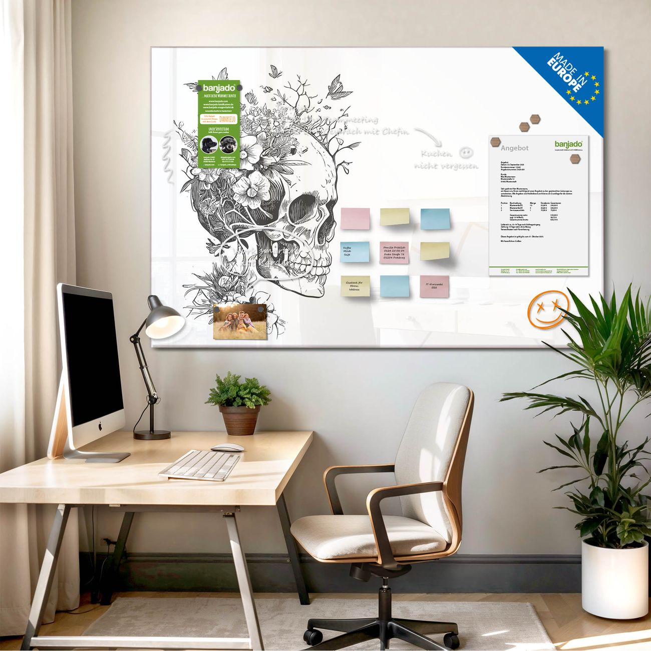 Jede Glas Magnettafel wird in unserer Werkstatt von Hand gefertigt und sorgfältig geprüft. So erhalten Sie ein echtes Qualitätsprodukt, das Funktion und Ästhetik perfekt vereint.?? Warum banjado?
