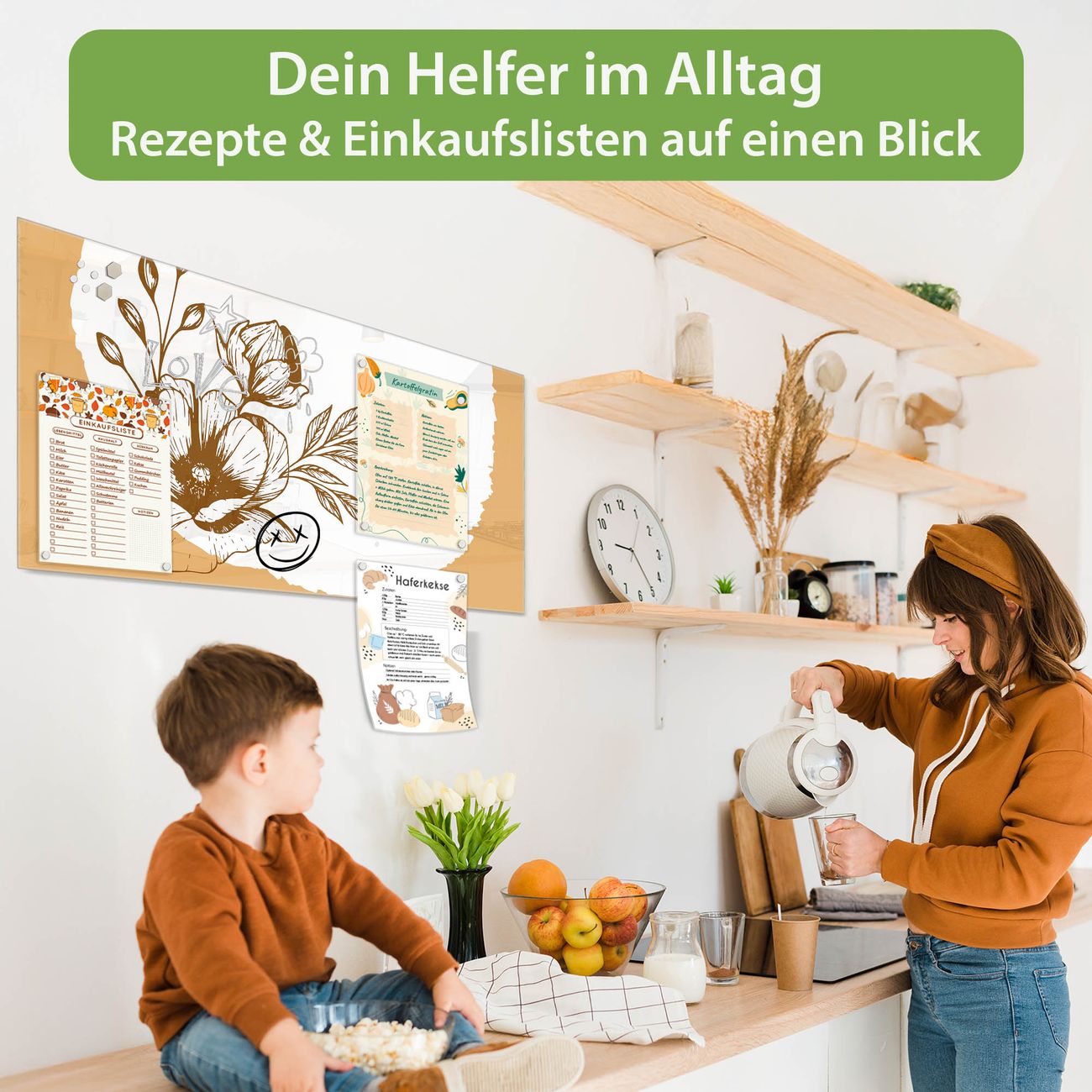Auf der glatten Glasoberfläche lassen sich Termine, Rezepte oder Notizen ganz einfach mit Kreidestiften festhalten und rückstandslos entfernen. Starke Neodym-Magnete halten Ihre wichtigsten Erinnerungen sicher an Ort und Stelle. So entsteht Ihre ganz persönliche Ideenwand - jeden Tag neu.