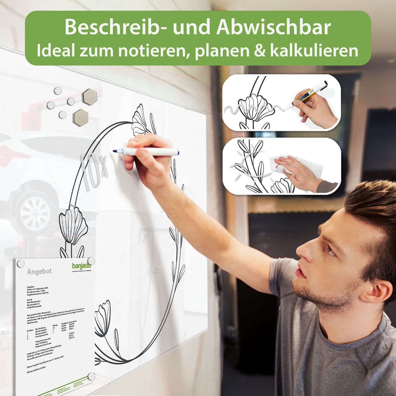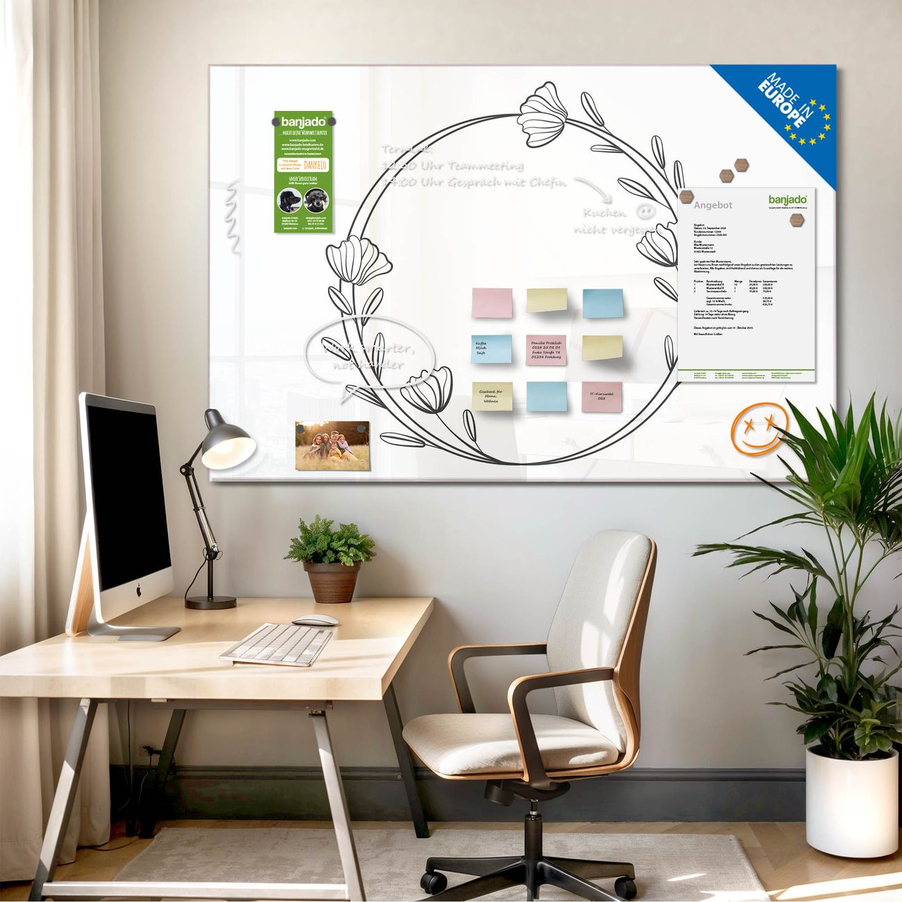 Jede Glas Magnettafel wird in unserer Werkstatt von Hand gefertigt und sorgfältig geprüft. So erhalten Sie ein echtes Qualitätsprodukt, das Funktion und Ästhetik perfekt vereint.?? Warum banjado?
