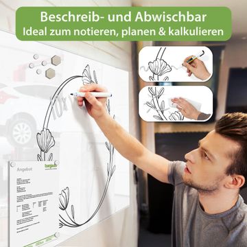 Auf der glatten Glasoberfläche lassen sich Termine, Rezepte oder Notizen ganz einfach mit Kreidestiften festhalten und rückstandslos entfernen. Starke Neodym-Magnete halten Ihre wichtigsten Erinnerungen sicher an Ort und Stelle. So entsteht Ihre ganz persönliche Ideenwand - jeden Tag neu.
