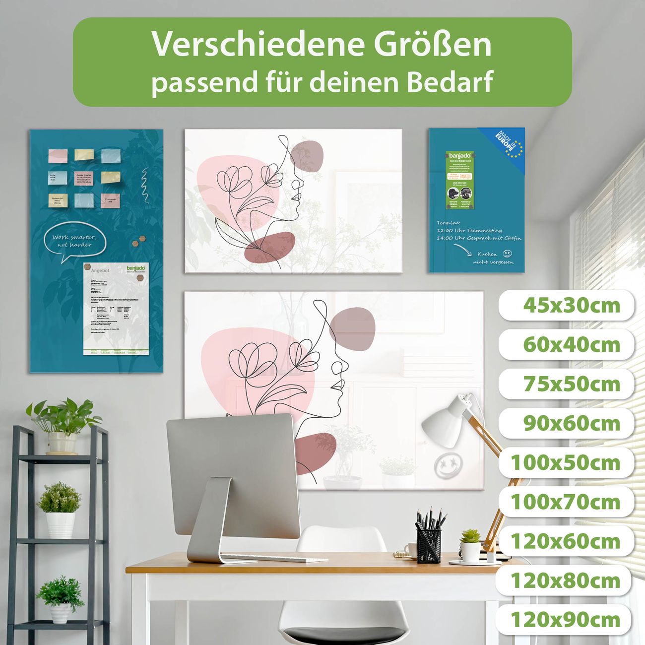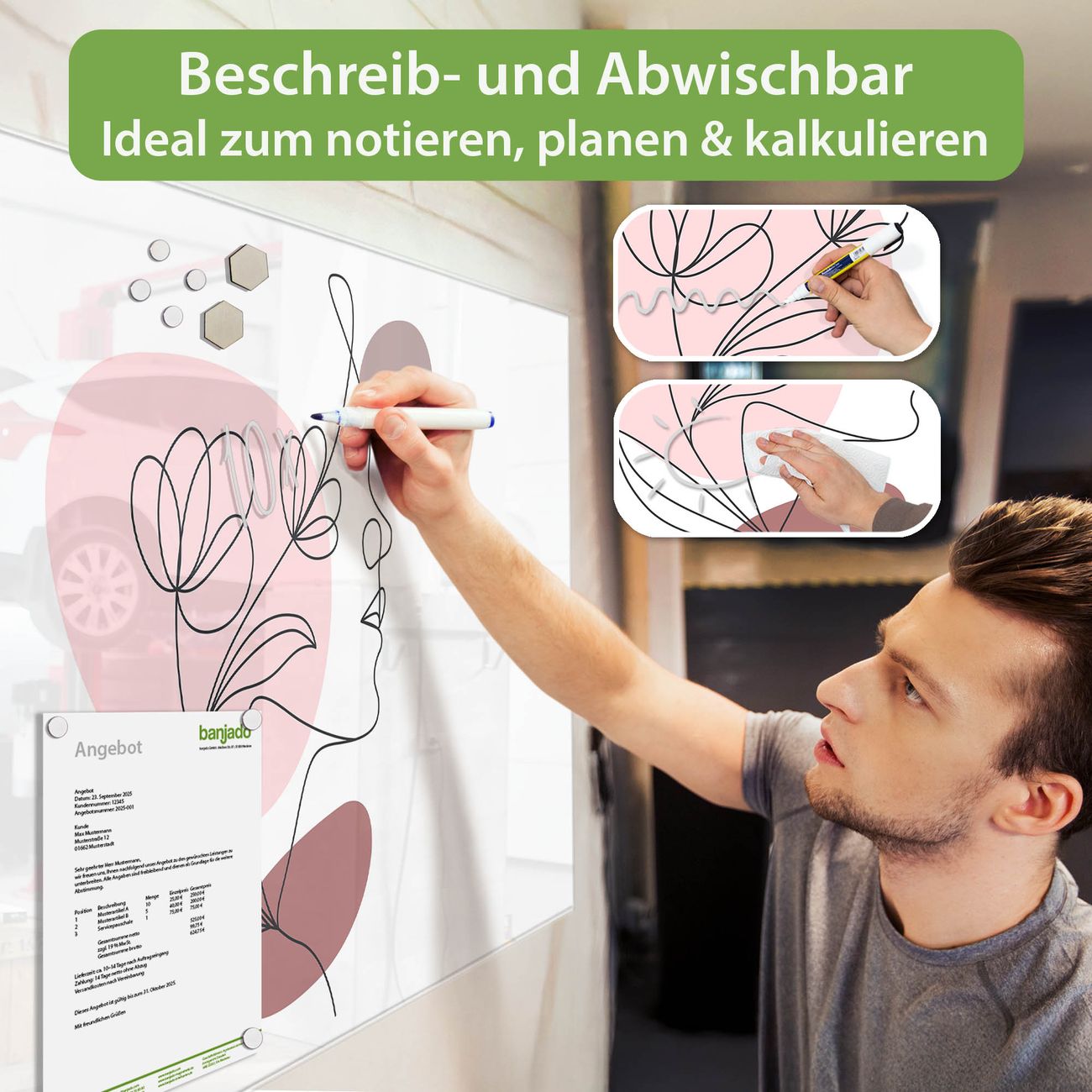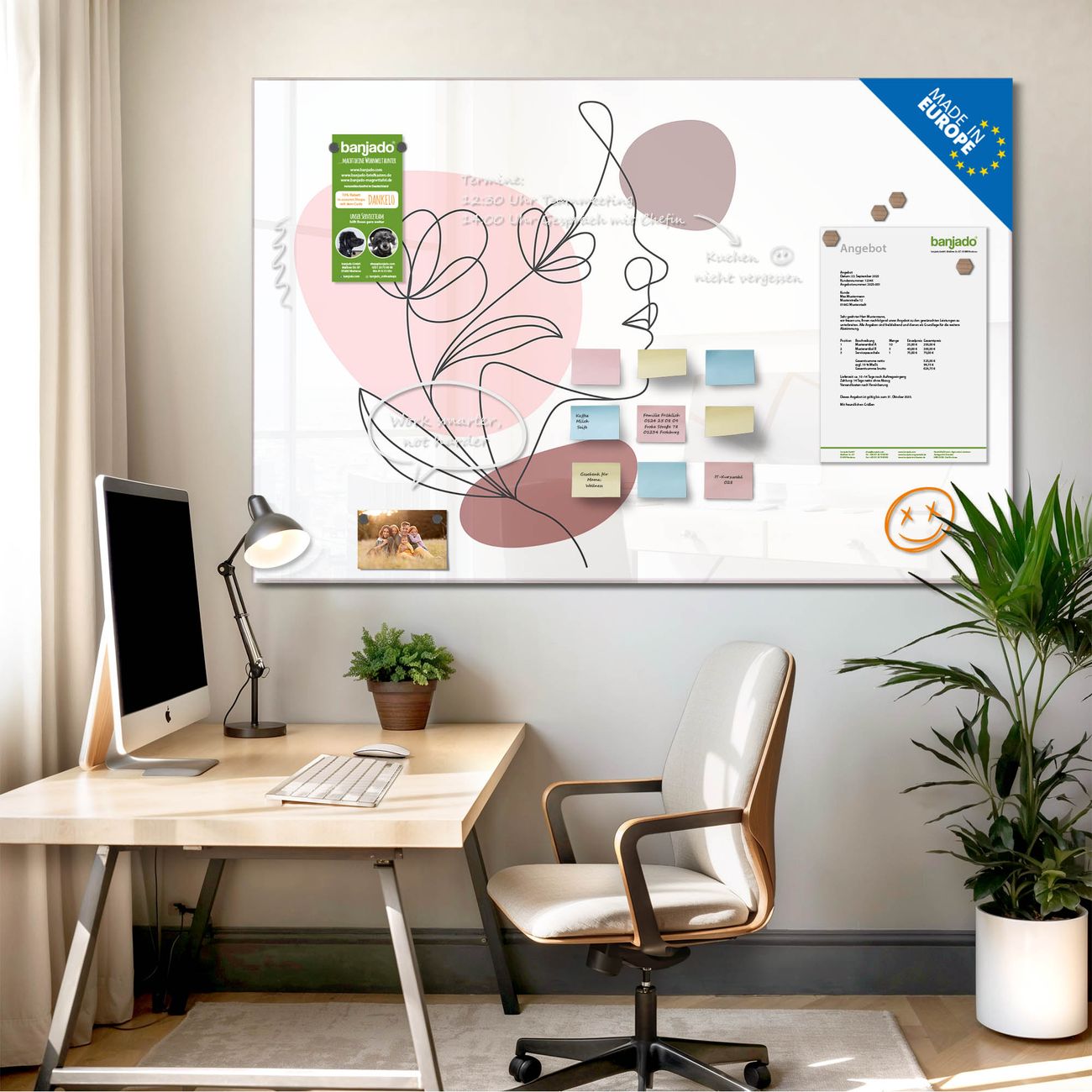 Jede Glas Magnettafel wird in unserer Werkstatt von Hand gefertigt und sorgfältig geprüft. So erhalten Sie ein echtes Qualitätsprodukt, das Funktion und Ästhetik perfekt vereint.?? Warum banjado?