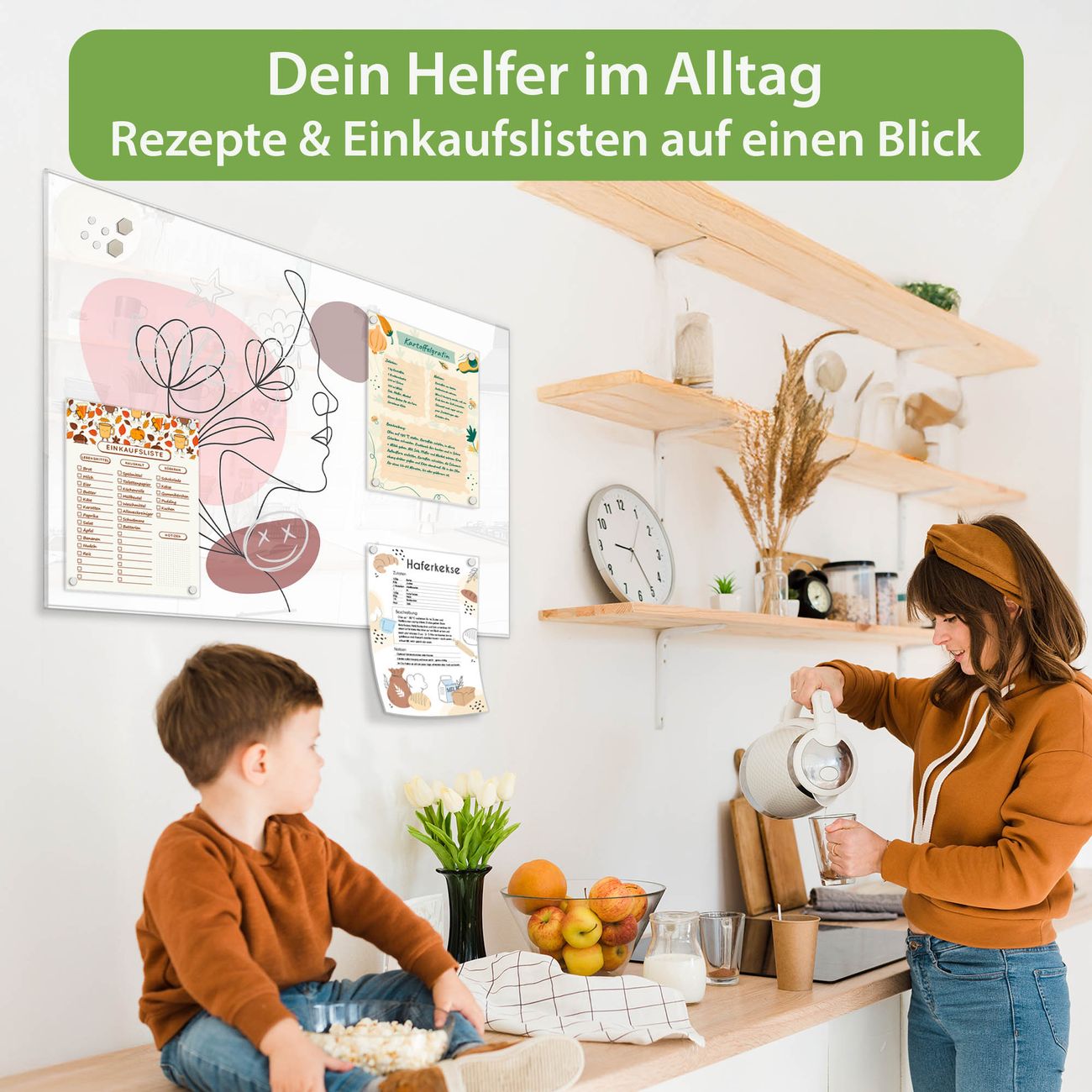 Auf der glatten Glasoberfläche lassen sich Termine, Rezepte oder Notizen ganz einfach mit Kreidestiften festhalten und rückstandslos entfernen. Starke Neodym-Magnete halten Ihre wichtigsten Erinnerungen sicher an Ort und Stelle. So entsteht Ihre ganz persönliche Ideenwand - jeden Tag neu.