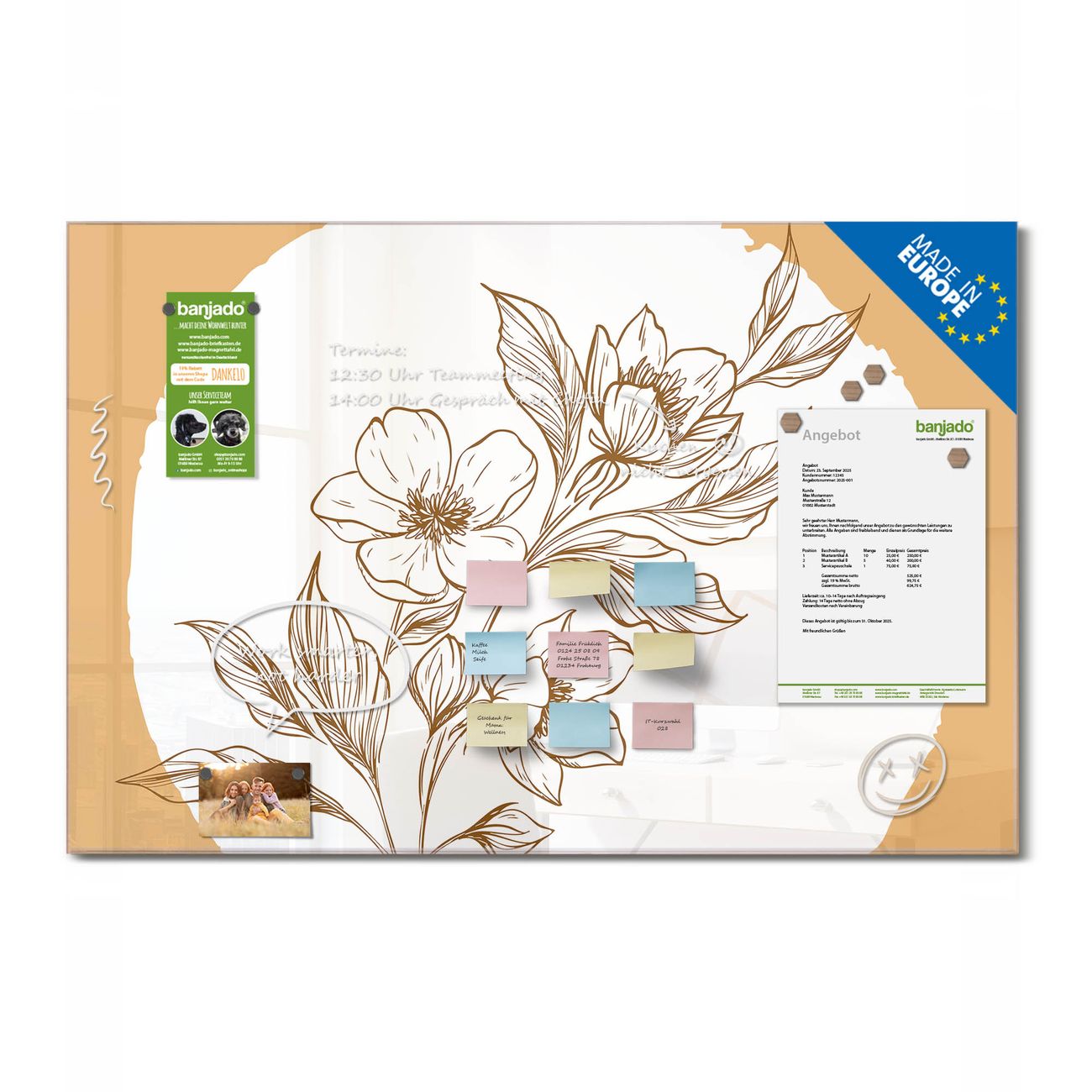 Jede Glas Magnettafel wird in unserer Werkstatt von Hand gefertigt und sorgfältig geprüft. So erhalten Sie ein echtes Qualitätsprodukt, das Funktion und Ästhetik perfekt vereint.?? Warum banjado?