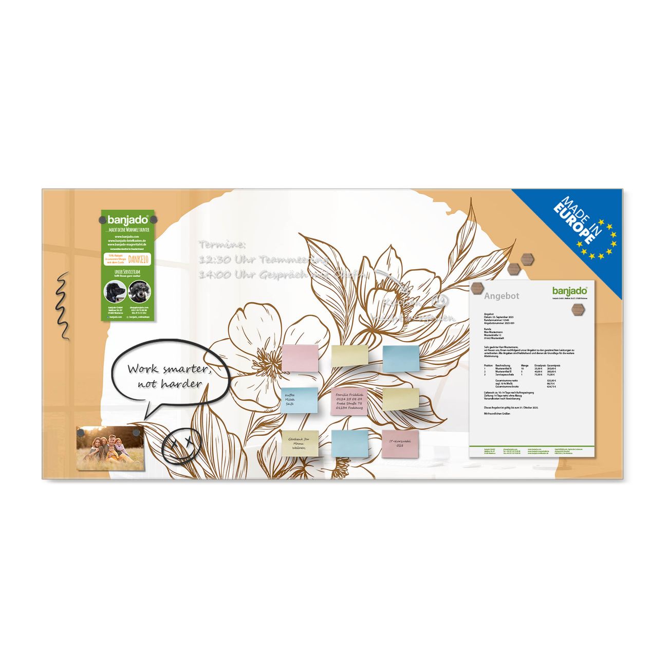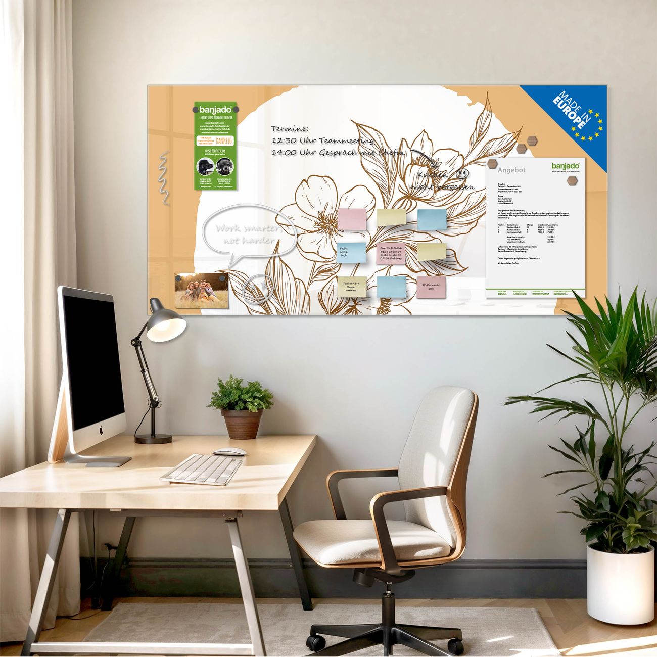 Jede Glas Magnettafel wird in unserer Werkstatt von Hand gefertigt und sorgfältig geprüft. So erhalten Sie ein echtes Qualitätsprodukt, das Funktion und Ästhetik perfekt vereint.?? Warum banjado?