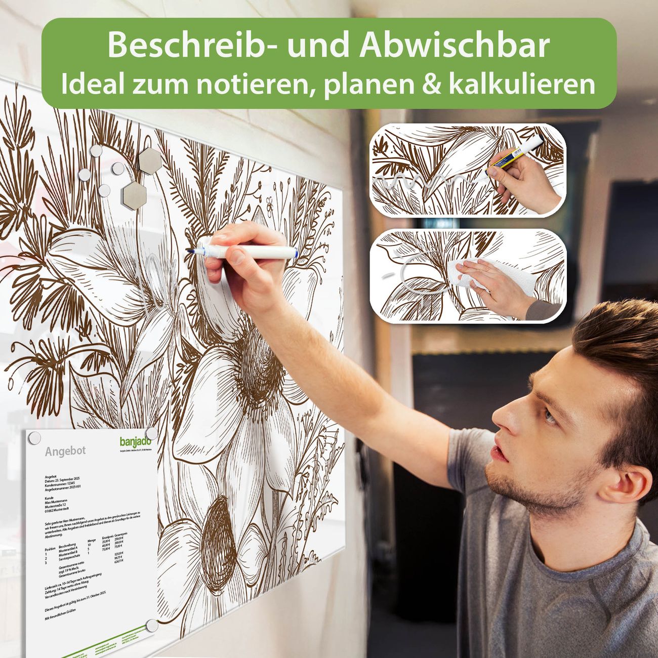 Jede Glas Magnettafel wird in unserer Werkstatt von Hand gefertigt und sorgfältig geprüft. So erhalten Sie ein echtes Qualitätsprodukt, das Funktion und Ästhetik perfekt vereint.?? Warum banjado?