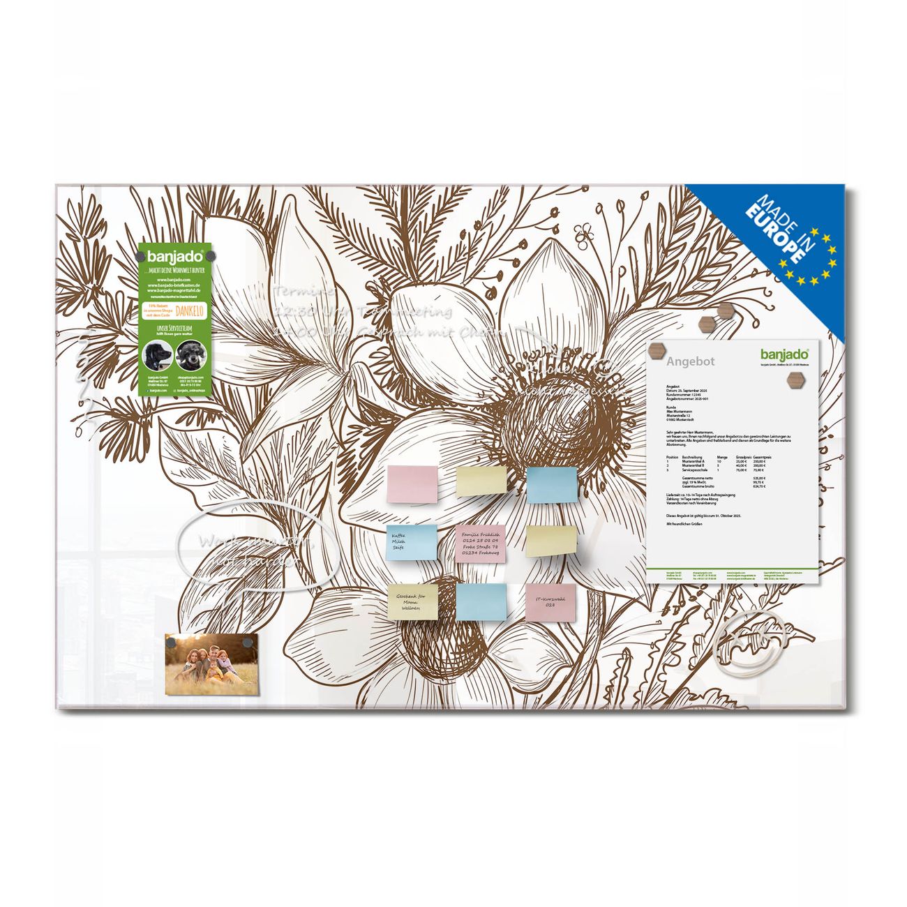Ein Stück Design, das Ihren Alltag organisiert. Schreiben, heften, inspirieren - alles an einem Ort. Qualität, die man spürt. Montage leicht gemacht. Handwerk mit Herz - veredelt in Sachsen. Einzigartiges Design mit Motiv Motiv Florale Zeichnung Beschreibbare Glasoberfläche, leicht zu reinigen Starke Magnetkraft durch Stahlrückwand Inklusive 4 Neodym-Magneten Flexible Montageoptionen Handveredelt in Sachsen - Qualität, die bleibt