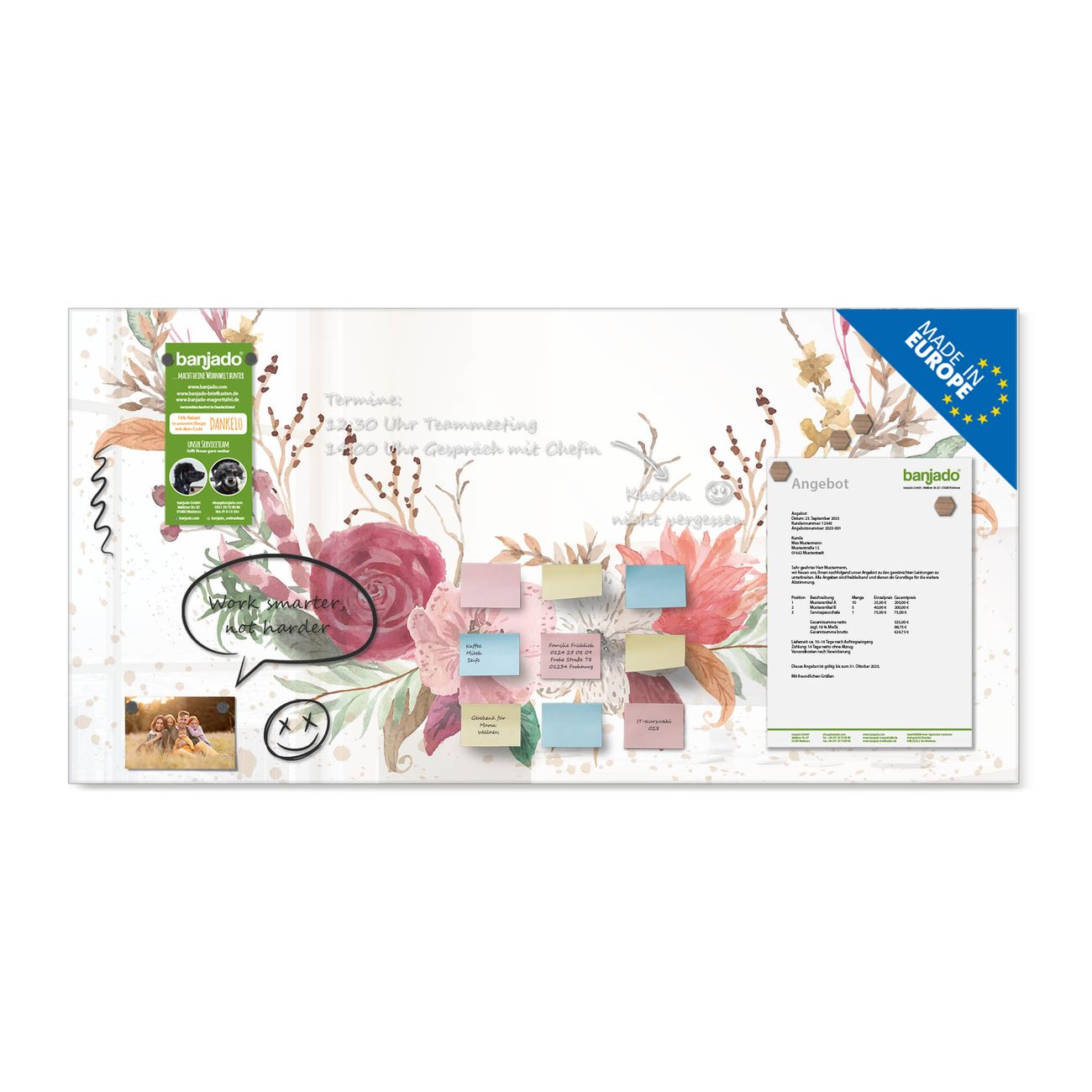 Ein Stück Design, das Ihren Alltag organisiert. Schreiben, heften, inspirieren - alles an einem Ort. Qualität, die man spürt. Montage leicht gemacht. Handwerk mit Herz - veredelt in Sachsen. Einzigartiges Design mit Motiv Motiv Floraler Blumenkranz Beschreibbare Glasoberfläche, leicht zu reinigen Starke Magnetkraft durch Stahlrückwand Inklusive 4 Neodym-Magneten Flexible Montageoptionen Handveredelt in Sachsen - Qualität, die bleibt