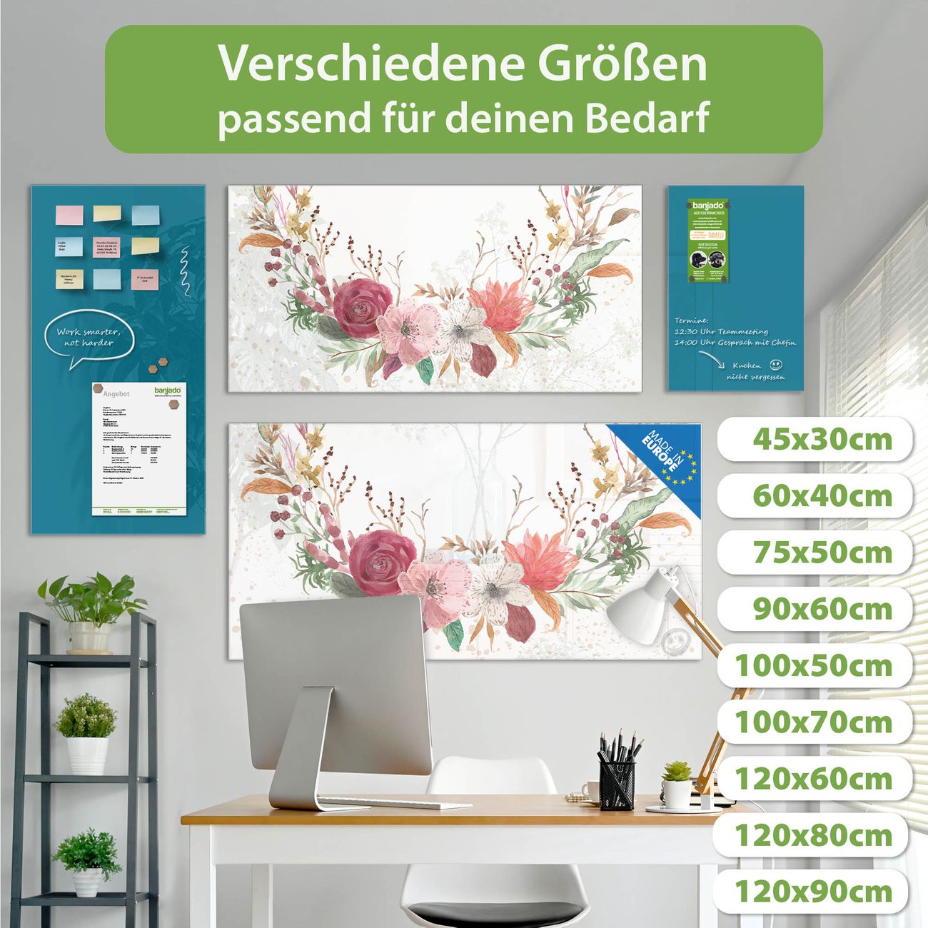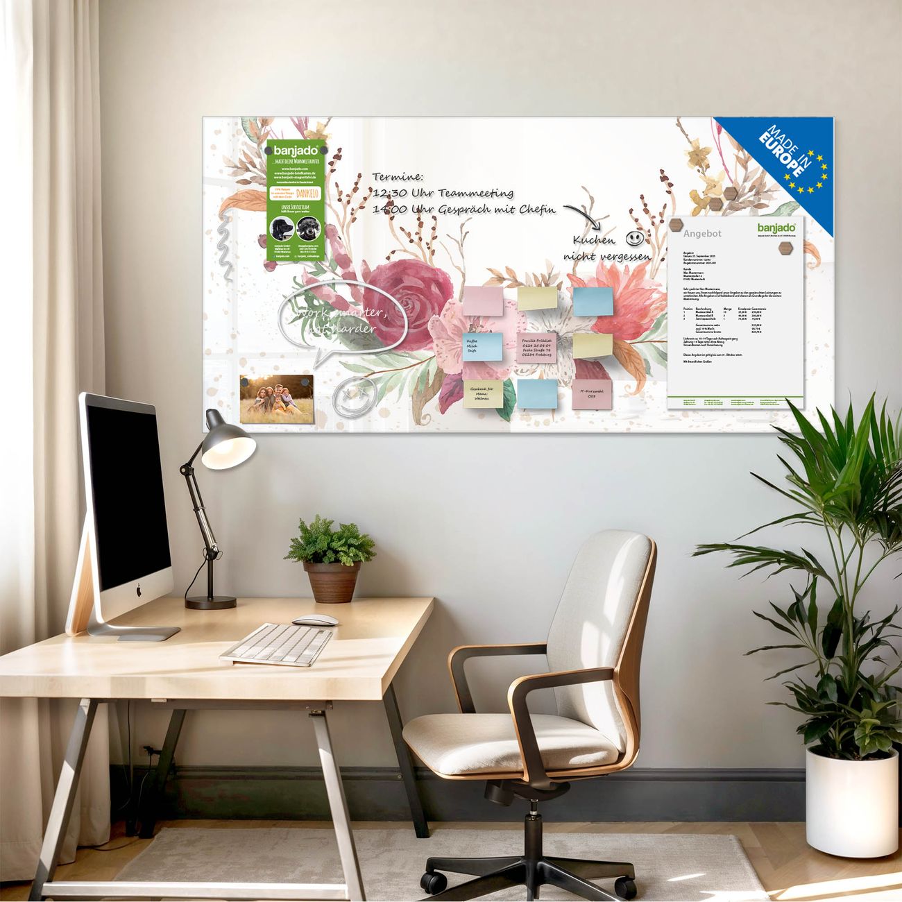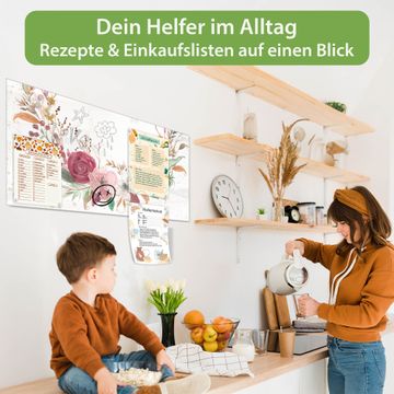 Die banjado Glas Magnettafel mit dem Motiv Motiv Floraler Blumenkranz verbindet Funktionalität mit Stil. Sie ersetzt das Zettelchaos durch klare Strukturen und bringt dabei eine warme, natürliche Atmosphäre in Ihr Zuhause. Ob im Büro, in der Küche oder im Eingangsbereich - dieses Design-Board zieht Blicke an und sorgt für Ordnung mit Charakter.