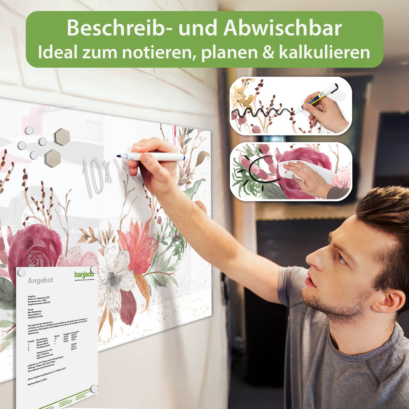 Jede Glas Magnettafel wird in unserer Werkstatt von Hand gefertigt und sorgfältig geprüft. So erhalten Sie ein echtes Qualitätsprodukt, das Funktion und Ästhetik perfekt vereint.?? Warum banjado?
