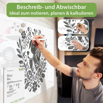 Ein Stück Design, das Ihren Alltag organisiert. Schreiben, heften, inspirieren - alles an einem Ort. Qualität, die man spürt. Montage leicht gemacht. Handwerk mit Herz - veredelt in Sachsen. Einzigartiges Design mit Motiv Motiv Floraler Hund Beschreibbare Glasoberfläche, leicht zu reinigen Starke Magnetkraft durch Stahlrückwand Inklusive 4 Neodym-Magneten Flexible Montageoptionen Handveredelt in Sachsen - Qualität, die bleibt