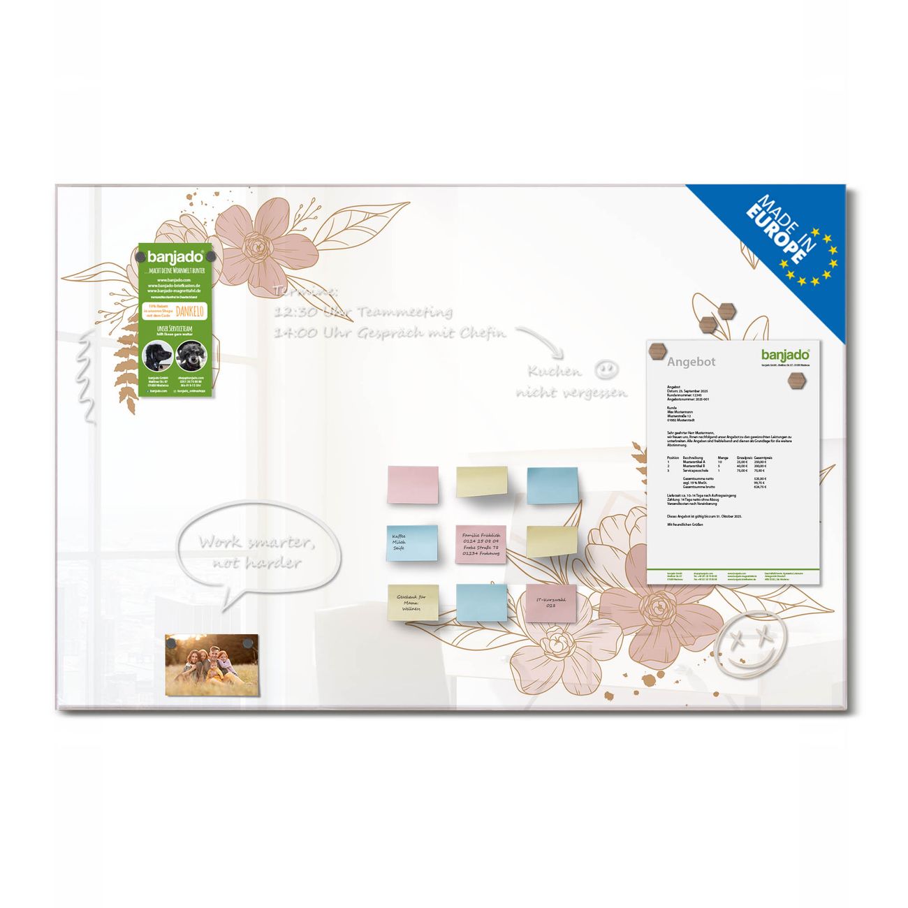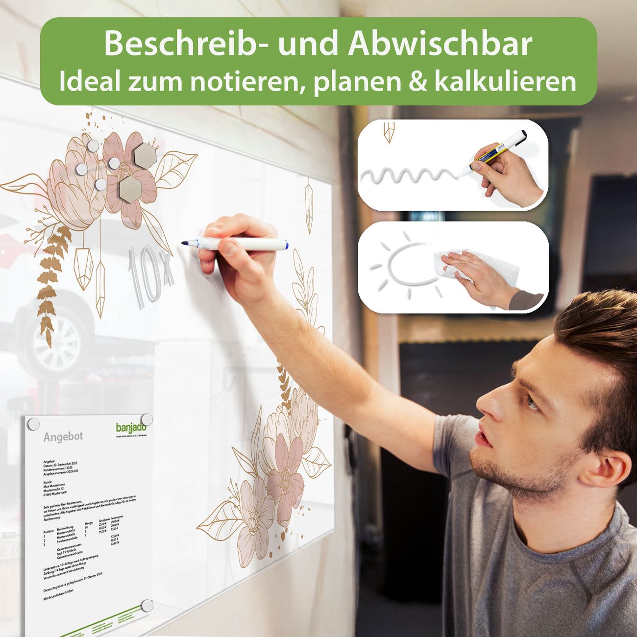 Jede Glas Magnettafel wird in unserer Werkstatt von Hand gefertigt und sorgfältig geprüft. So erhalten Sie ein echtes Qualitätsprodukt, das Funktion und Ästhetik perfekt vereint.?? Warum banjado?