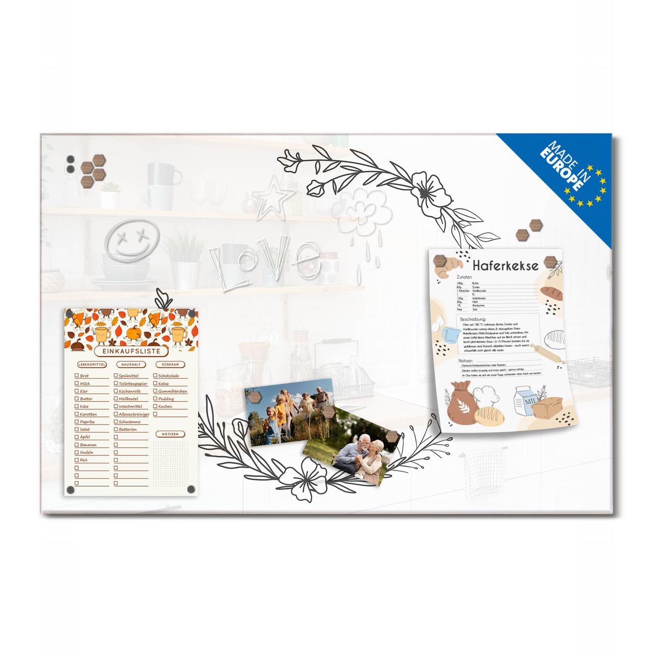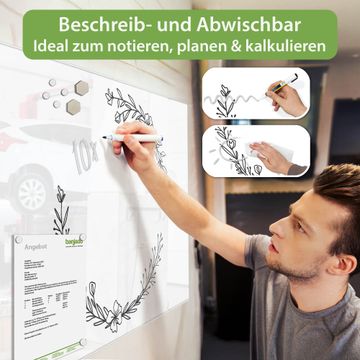 Auf der glatten Glasoberfläche lassen sich Termine, Rezepte oder Notizen ganz einfach mit Kreidestiften festhalten und rückstandslos entfernen. Starke Neodym-Magnete halten Ihre wichtigsten Erinnerungen sicher an Ort und Stelle. So entsteht Ihre ganz persönliche Ideenwand - jeden Tag neu.