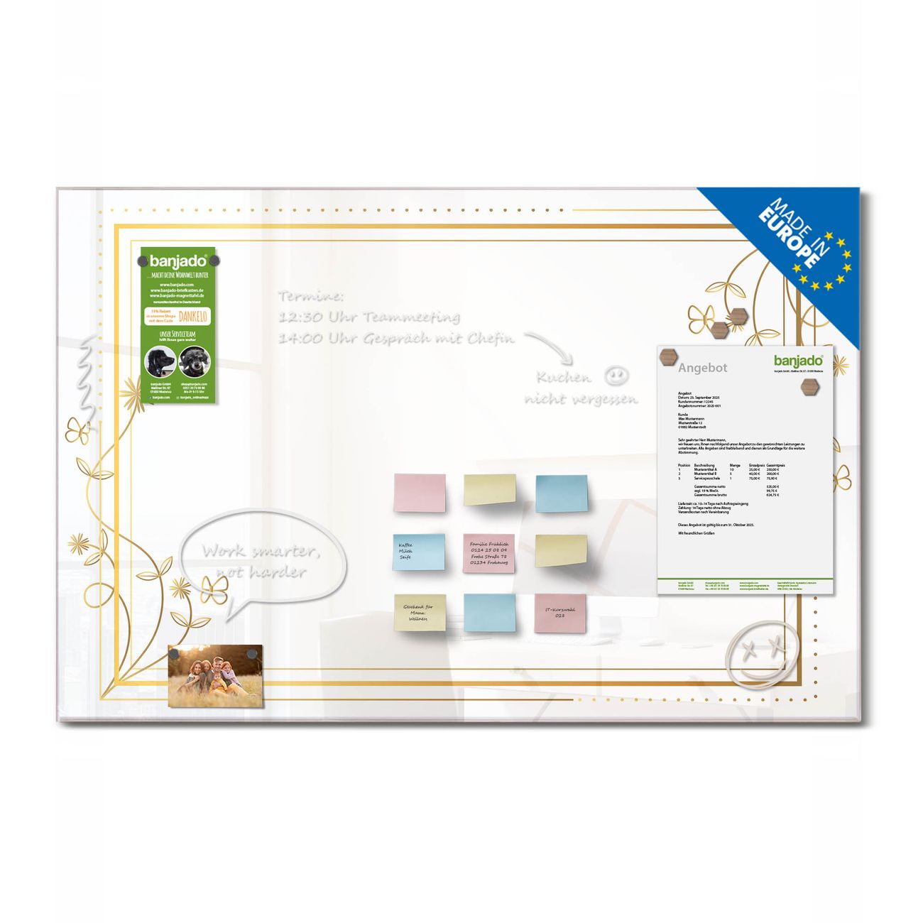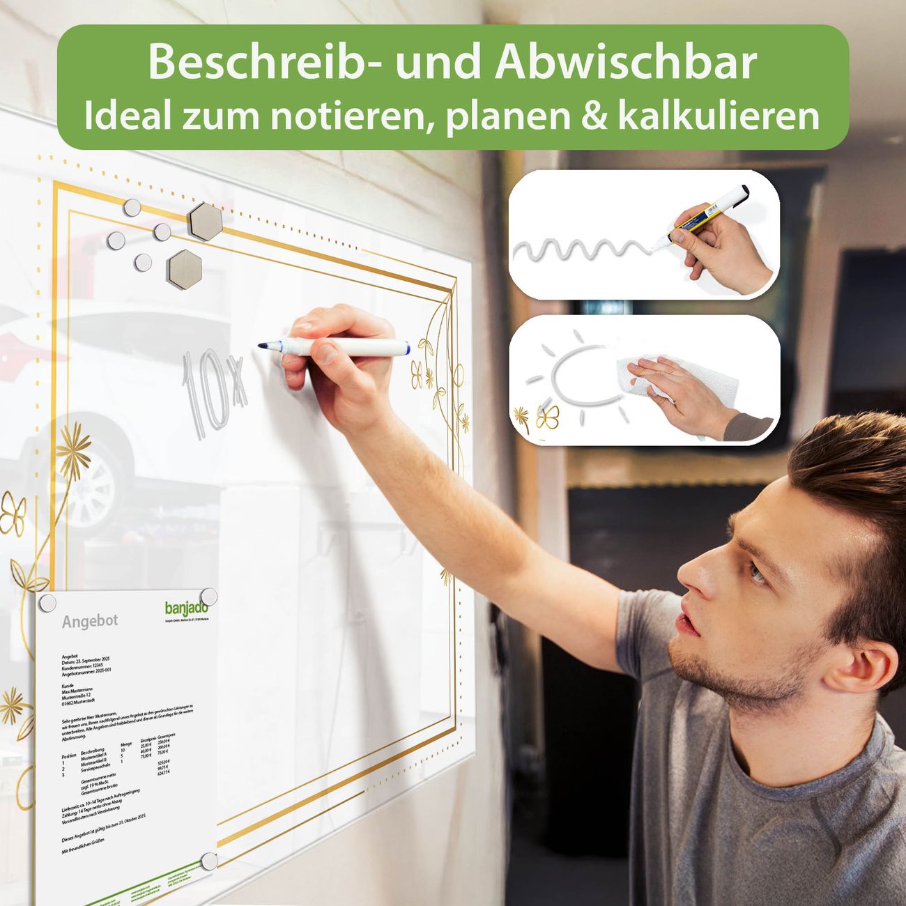 Jede Glas Magnettafel wird in unserer Werkstatt von Hand gefertigt und sorgfältig geprüft. So erhalten Sie ein echtes Qualitätsprodukt, das Funktion und Ästhetik perfekt vereint.?? Warum banjado?