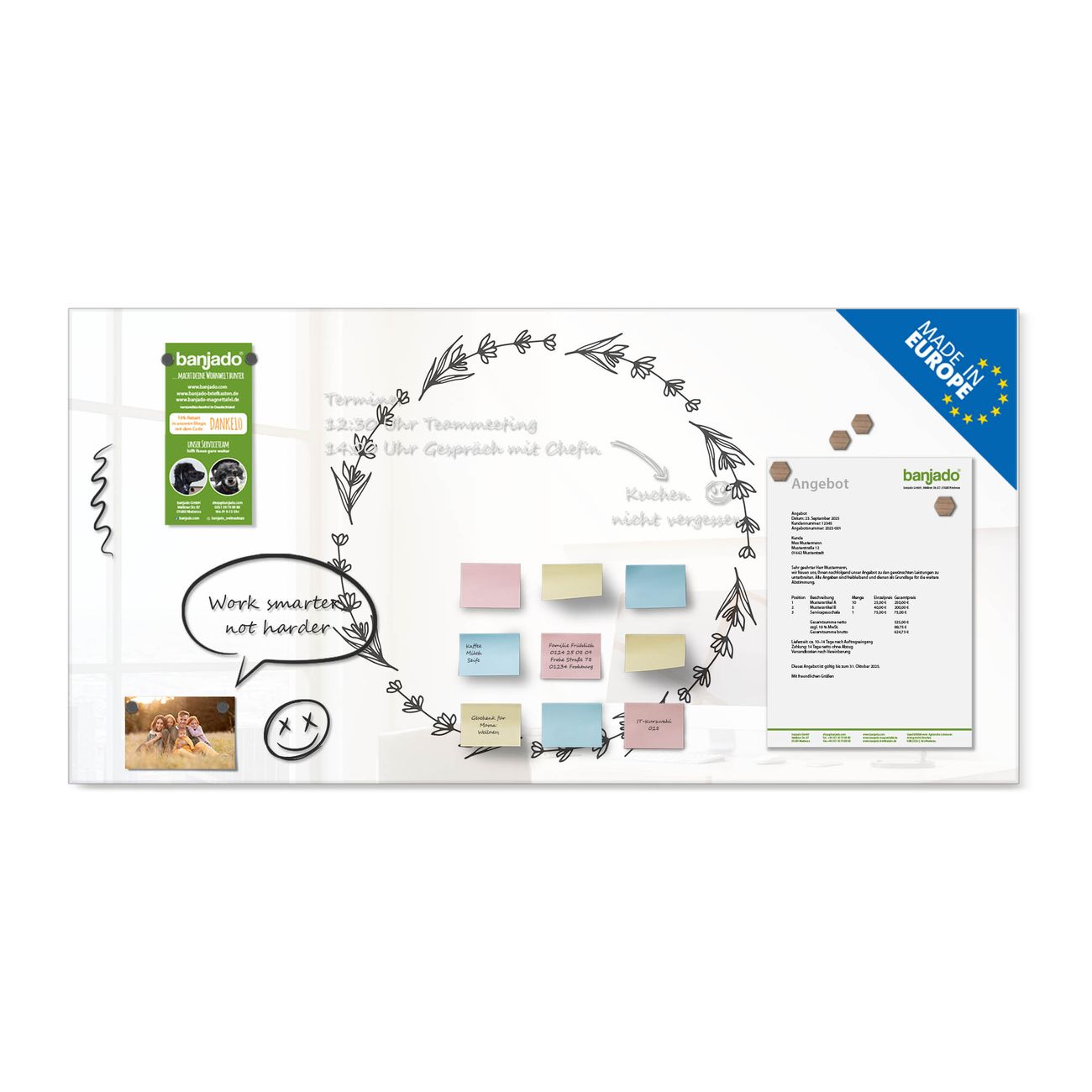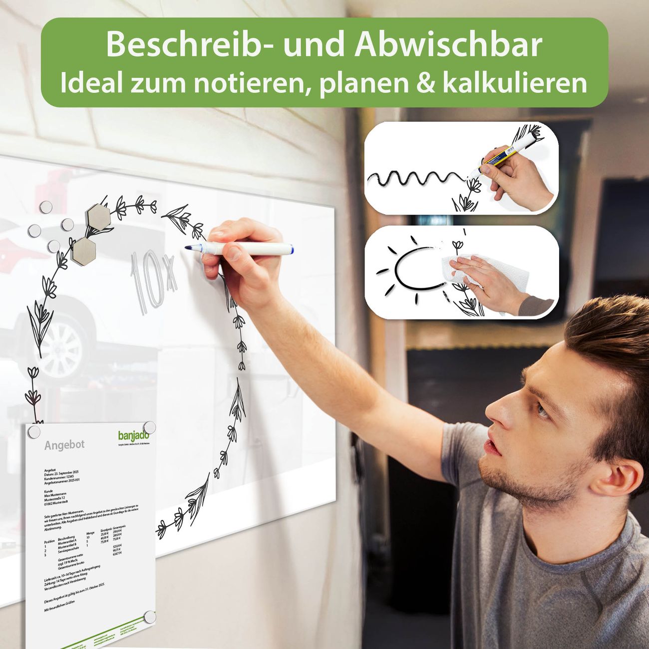 Jede Glas Magnettafel wird in unserer Werkstatt von Hand gefertigt und sorgfältig geprüft. So erhalten Sie ein echtes Qualitätsprodukt, das Funktion und Ästhetik perfekt vereint.?? Warum banjado?