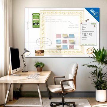 Auf der glatten Glasoberfläche lassen sich Termine, Rezepte oder Notizen ganz einfach mit Kreidestiften festhalten und rückstandslos entfernen. Starke Neodym-Magnete halten Ihre wichtigsten Erinnerungen sicher an Ort und Stelle. So entsteht Ihre ganz persönliche Ideenwand - jeden Tag neu.
