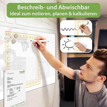 Auf der glatten Glasoberfläche lassen sich Termine, Rezepte oder Notizen ganz einfach mit Kreidestiften festhalten und rückstandslos entfernen. Starke Neodym-Magnete halten Ihre wichtigsten Erinnerungen sicher an Ort und Stelle. So entsteht Ihre ganz persönliche Ideenwand - jeden Tag neu.