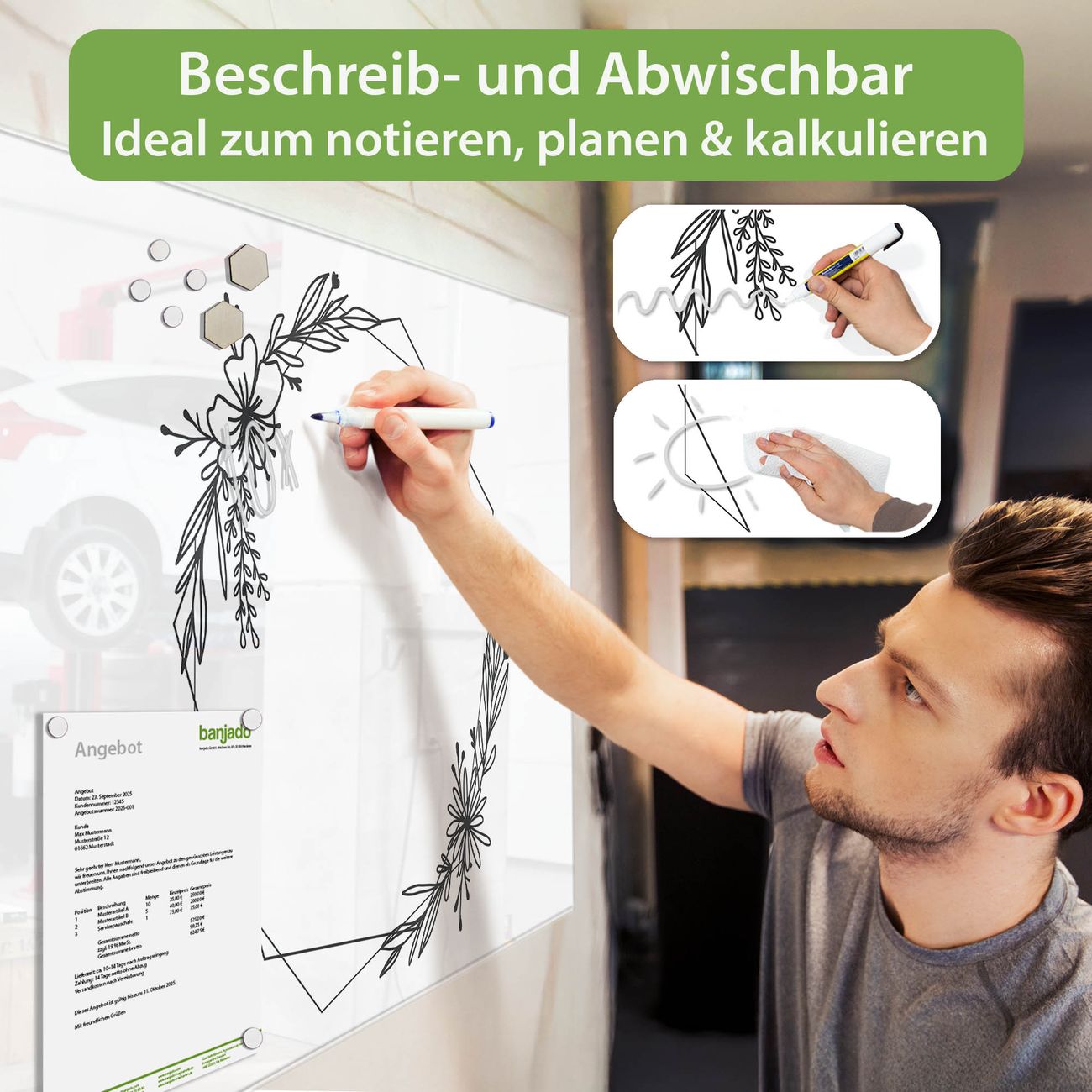 Jede Glas Magnettafel wird in unserer Werkstatt von Hand gefertigt und sorgfältig geprüft. So erhalten Sie ein echtes Qualitätsprodukt, das Funktion und Ästhetik perfekt vereint.?? Warum banjado?