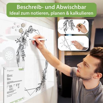 Auf der glatten Glasoberfläche lassen sich Termine, Rezepte oder Notizen ganz einfach mit Kreidestiften festhalten und rückstandslos entfernen. Starke Neodym-Magnete halten Ihre wichtigsten Erinnerungen sicher an Ort und Stelle. So entsteht Ihre ganz persönliche Ideenwand - jeden Tag neu.