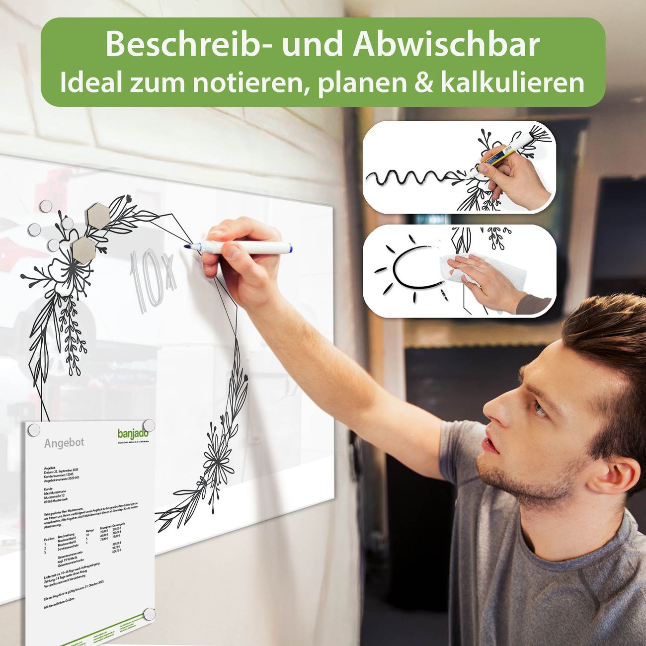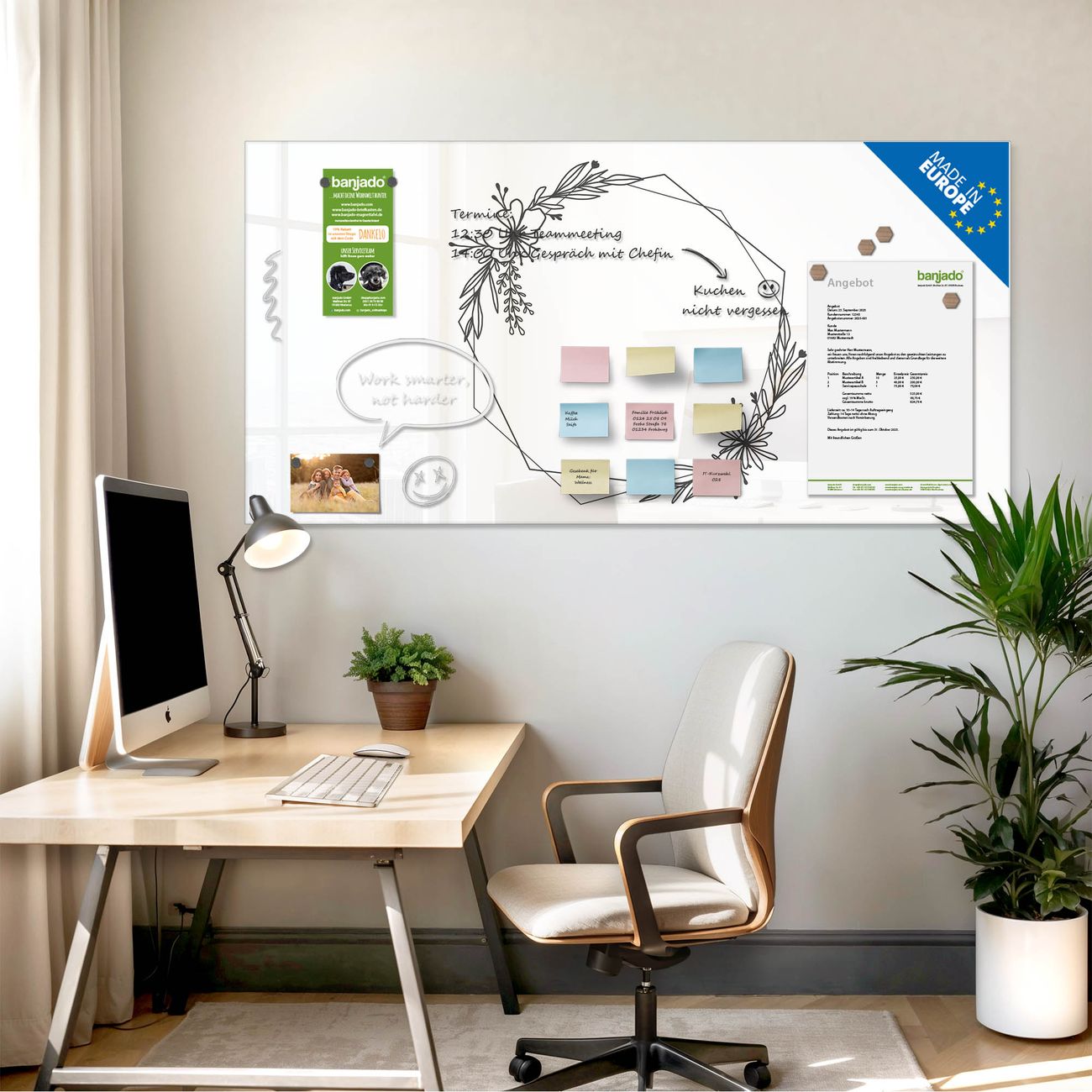 Jede Glas Magnettafel wird in unserer Werkstatt von Hand gefertigt und sorgfältig geprüft. So erhalten Sie ein echtes Qualitätsprodukt, das Funktion und Ästhetik perfekt vereint.?? Warum banjado?