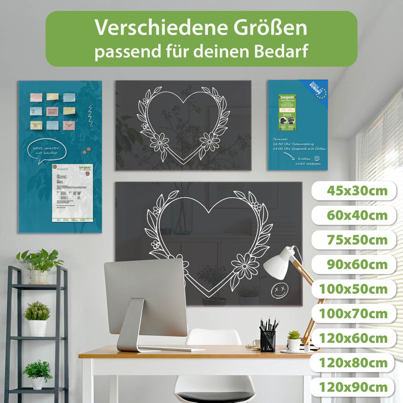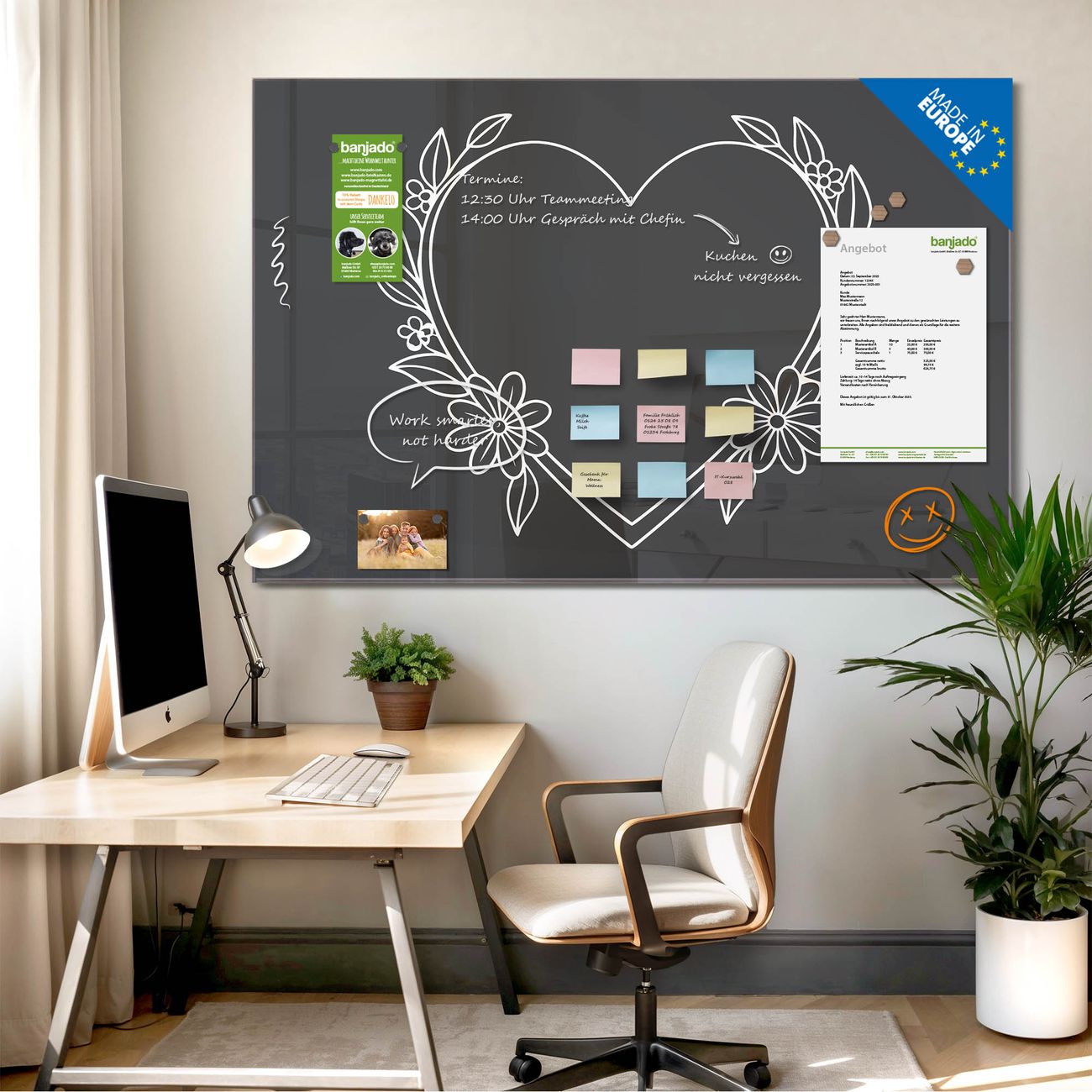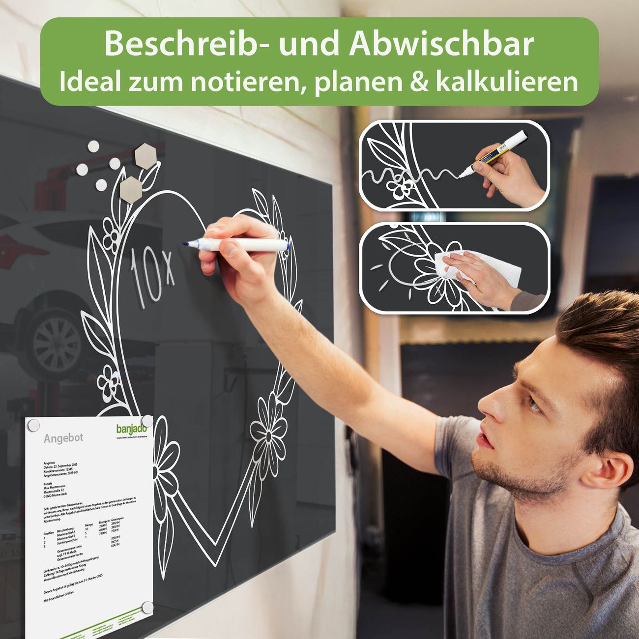 Jede Glas Magnettafel wird in unserer Werkstatt von Hand gefertigt und sorgfältig geprüft. So erhalten Sie ein echtes Qualitätsprodukt, das Funktion und Ästhetik perfekt vereint.?? Warum banjado?