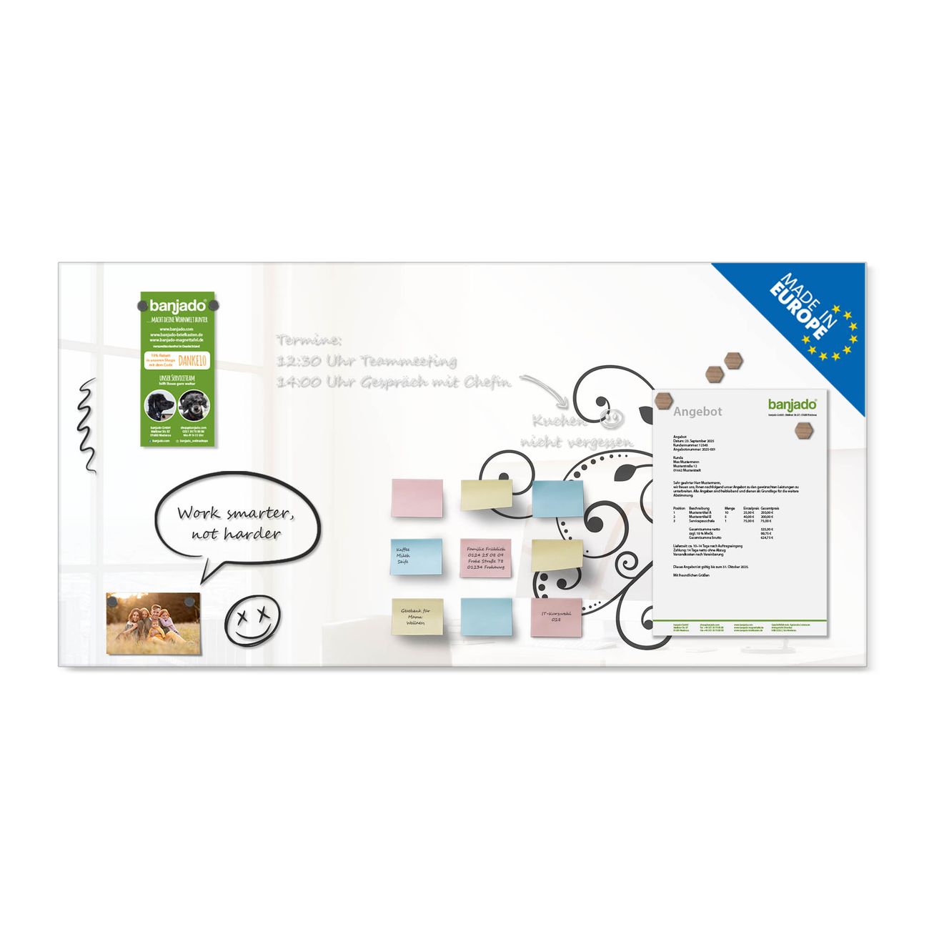 Jede Glas Magnettafel wird in unserer Werkstatt von Hand gefertigt und sorgfältig geprüft. So erhalten Sie ein echtes Qualitätsprodukt, das Funktion und Ästhetik perfekt vereint.?? Warum banjado?