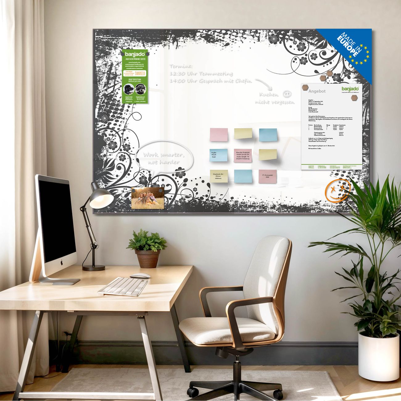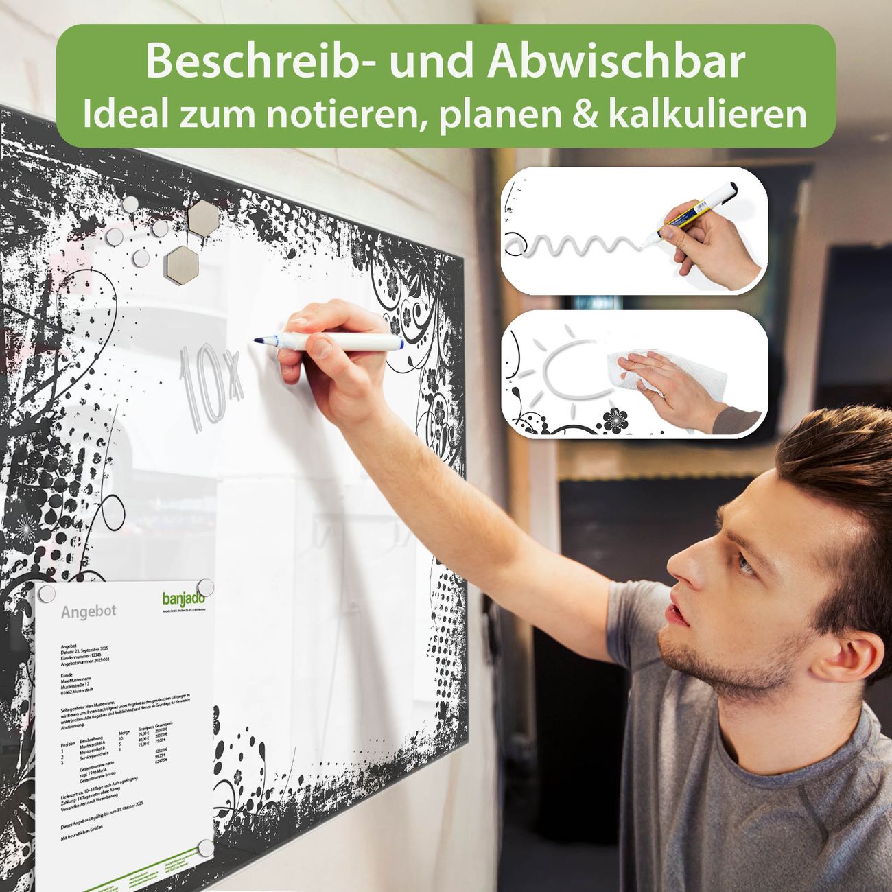 Die banjado Glas Magnettafel mit dem Motiv Motiv Florales Schwarz-Weiß Muster verbindet Funktionalität mit Stil. Sie ersetzt das Zettelchaos durch klare Strukturen und bringt dabei eine warme, natürliche Atmosphäre in Ihr Zuhause. Ob im Büro, in der Küche oder im Eingangsbereich - dieses Design-Board zieht Blicke an und sorgt für Ordnung mit Charakter.