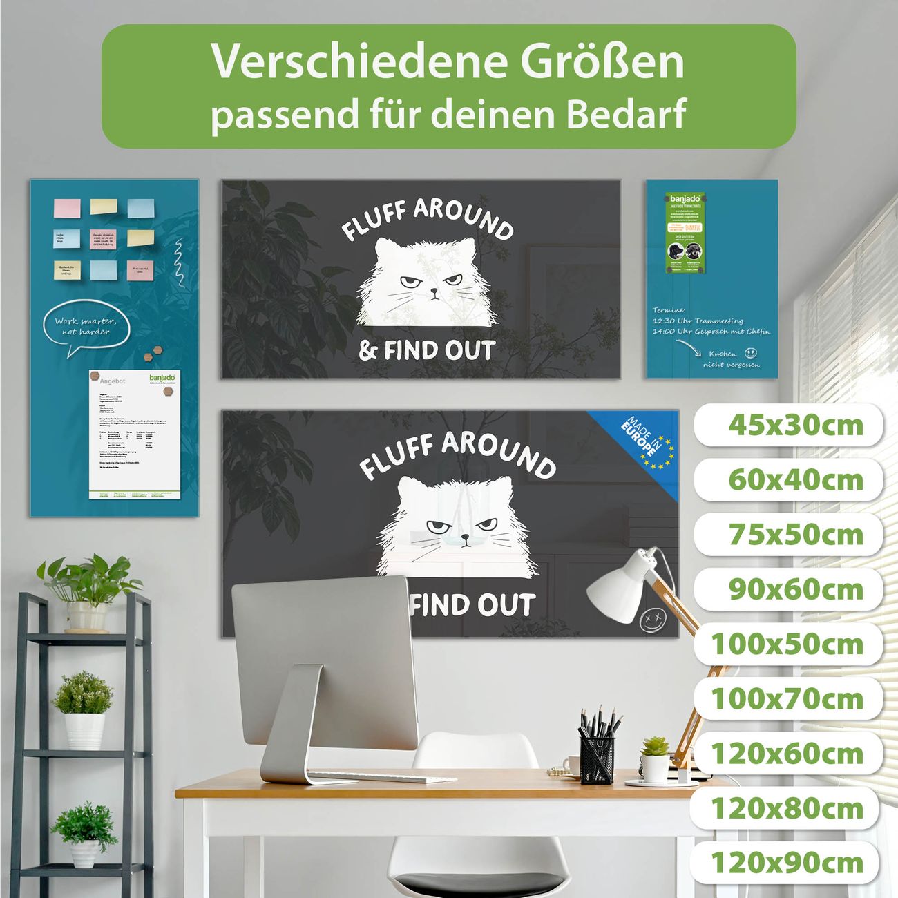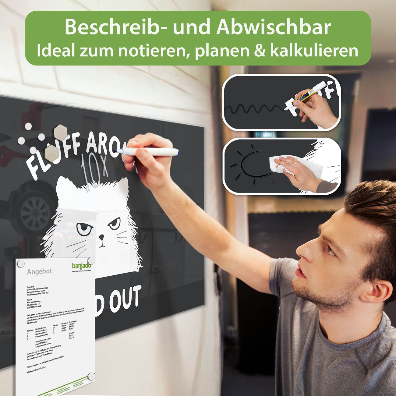 Jede Glas Magnettafel wird in unserer Werkstatt von Hand gefertigt und sorgfältig geprüft. So erhalten Sie ein echtes Qualitätsprodukt, das Funktion und Ästhetik perfekt vereint.?? Warum banjado?