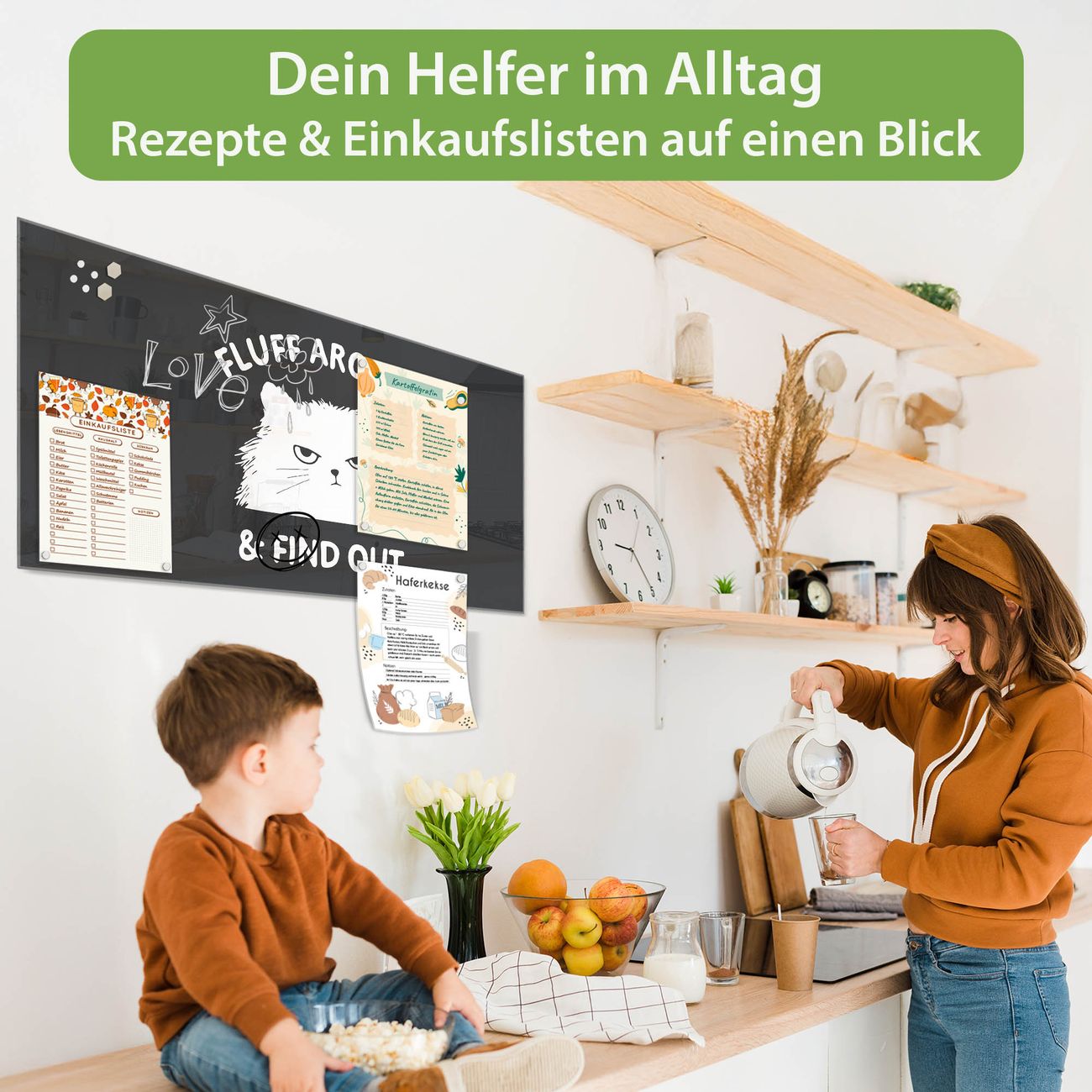 Auf der glatten Glasoberfläche lassen sich Termine, Rezepte oder Notizen ganz einfach mit Kreidestiften festhalten und rückstandslos entfernen. Starke Neodym-Magnete halten Ihre wichtigsten Erinnerungen sicher an Ort und Stelle. So entsteht Ihre ganz persönliche Ideenwand - jeden Tag neu.