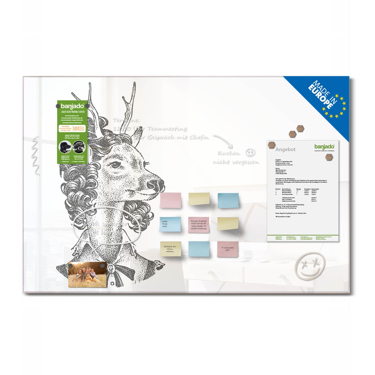 Jede Glas Magnettafel wird in unserer Werkstatt von Hand gefertigt und sorgfältig geprüft. So erhalten Sie ein echtes Qualitätsprodukt, das Funktion und Ästhetik perfekt vereint.?? Warum banjado?