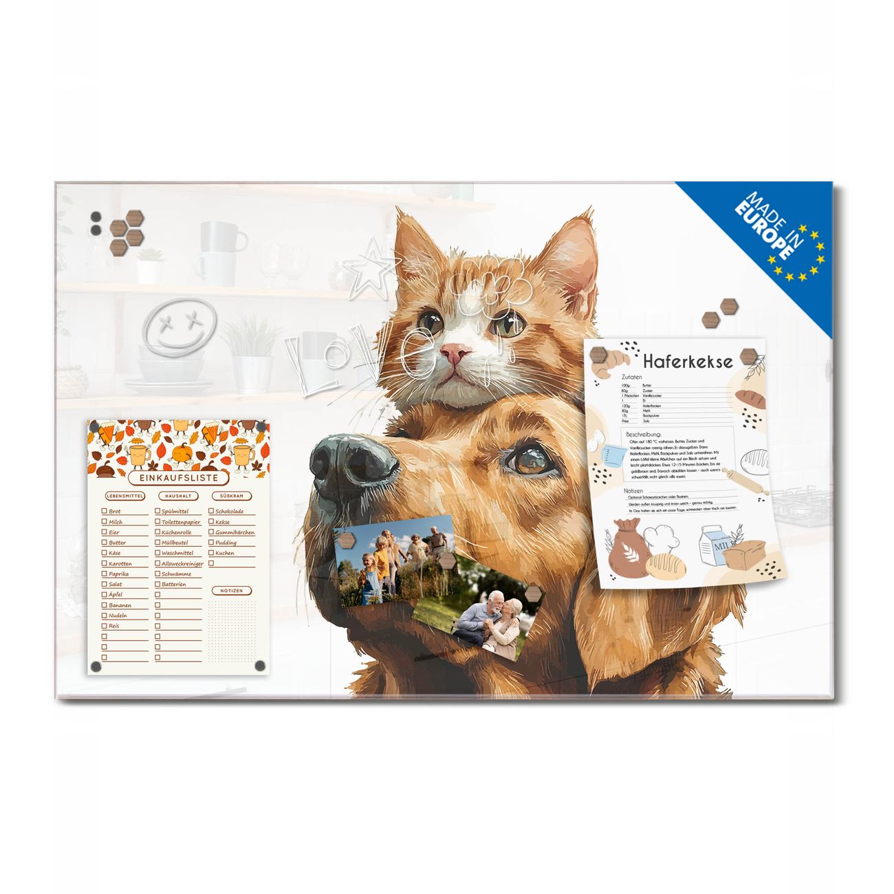 Ein Stück Design, das Ihren Alltag organisiert. Schreiben, heften, inspirieren - alles an einem Ort. Qualität, die man spürt. Montage leicht gemacht. Handwerk mit Herz - veredelt in Sachsen. Einzigartiges Design mit Motiv Motiv Freundschaft in Fell Beschreibbare Glasoberfläche, leicht zu reinigen Starke Magnetkraft durch Stahlrückwand Inklusive 4 Neodym-Magneten Flexible Montageoptionen Handveredelt in Sachsen - Qualität, die bleibt